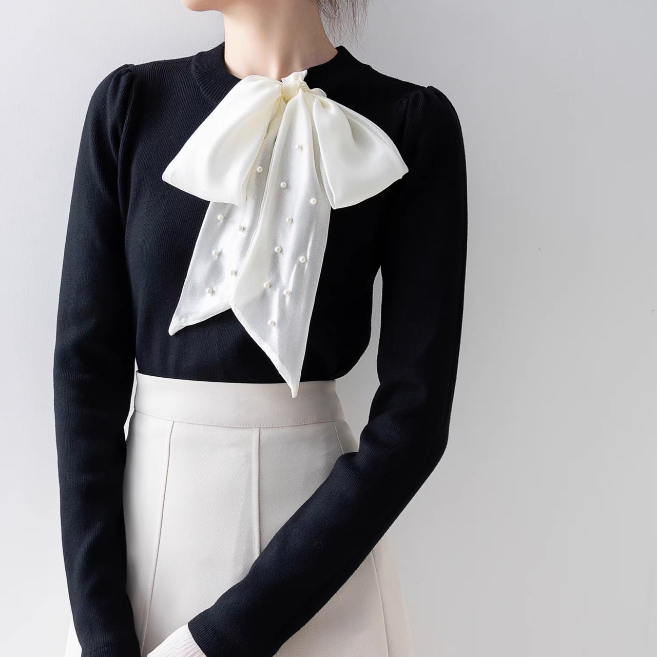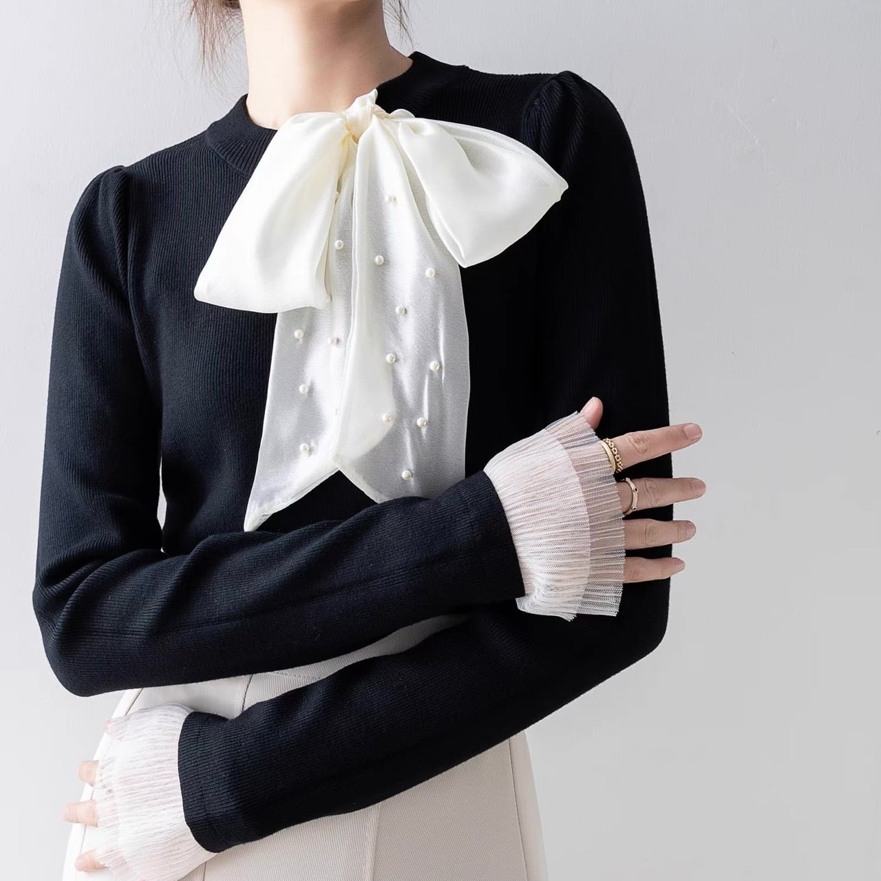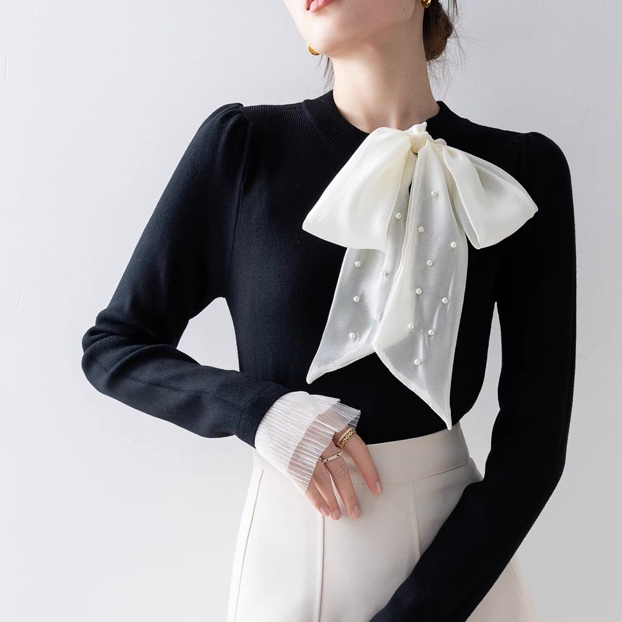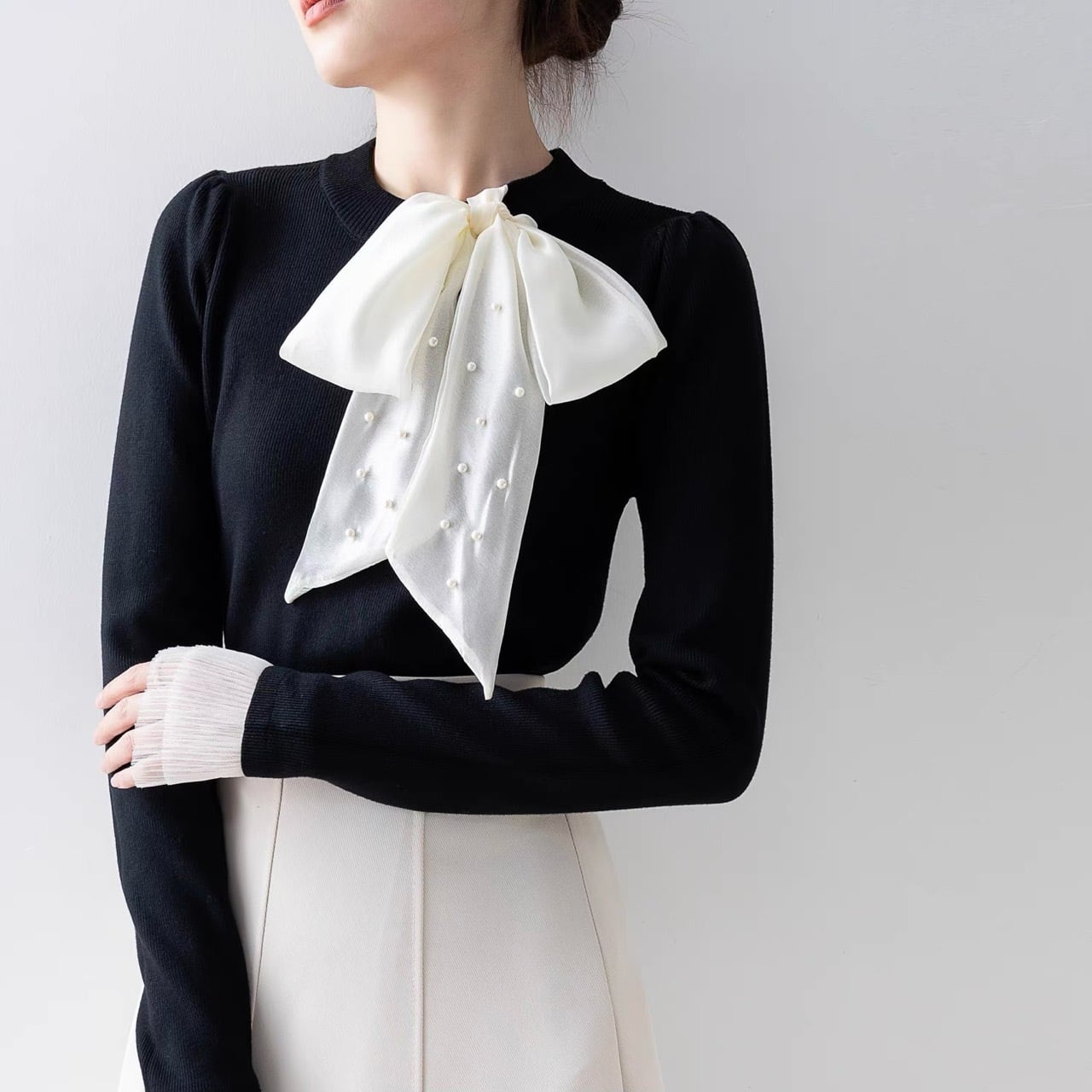 優雅なパールボウタイとフリルスリーブが特徴のトップスです。