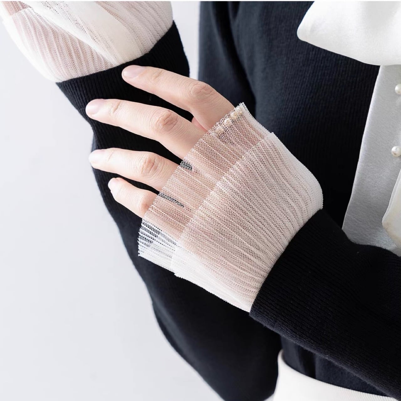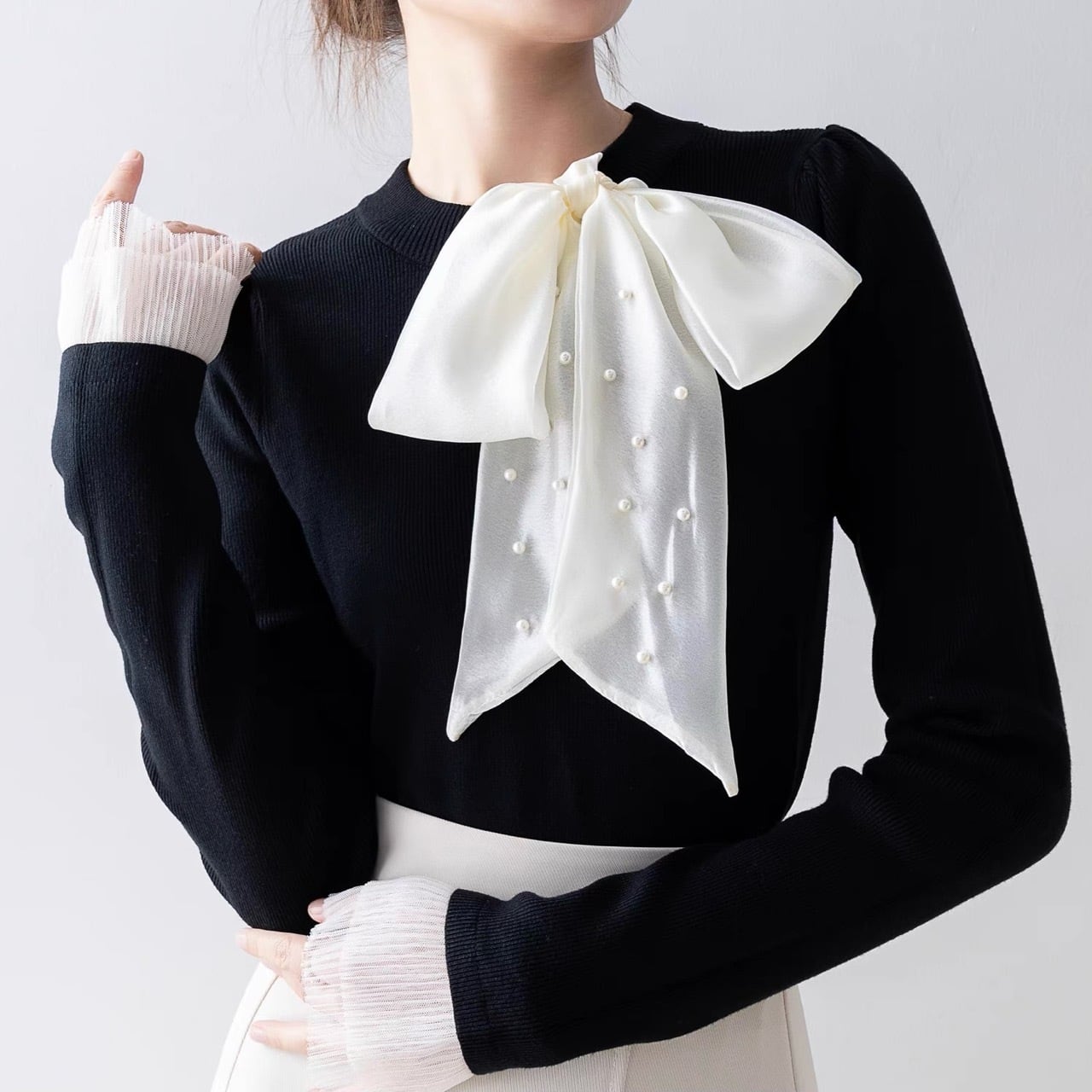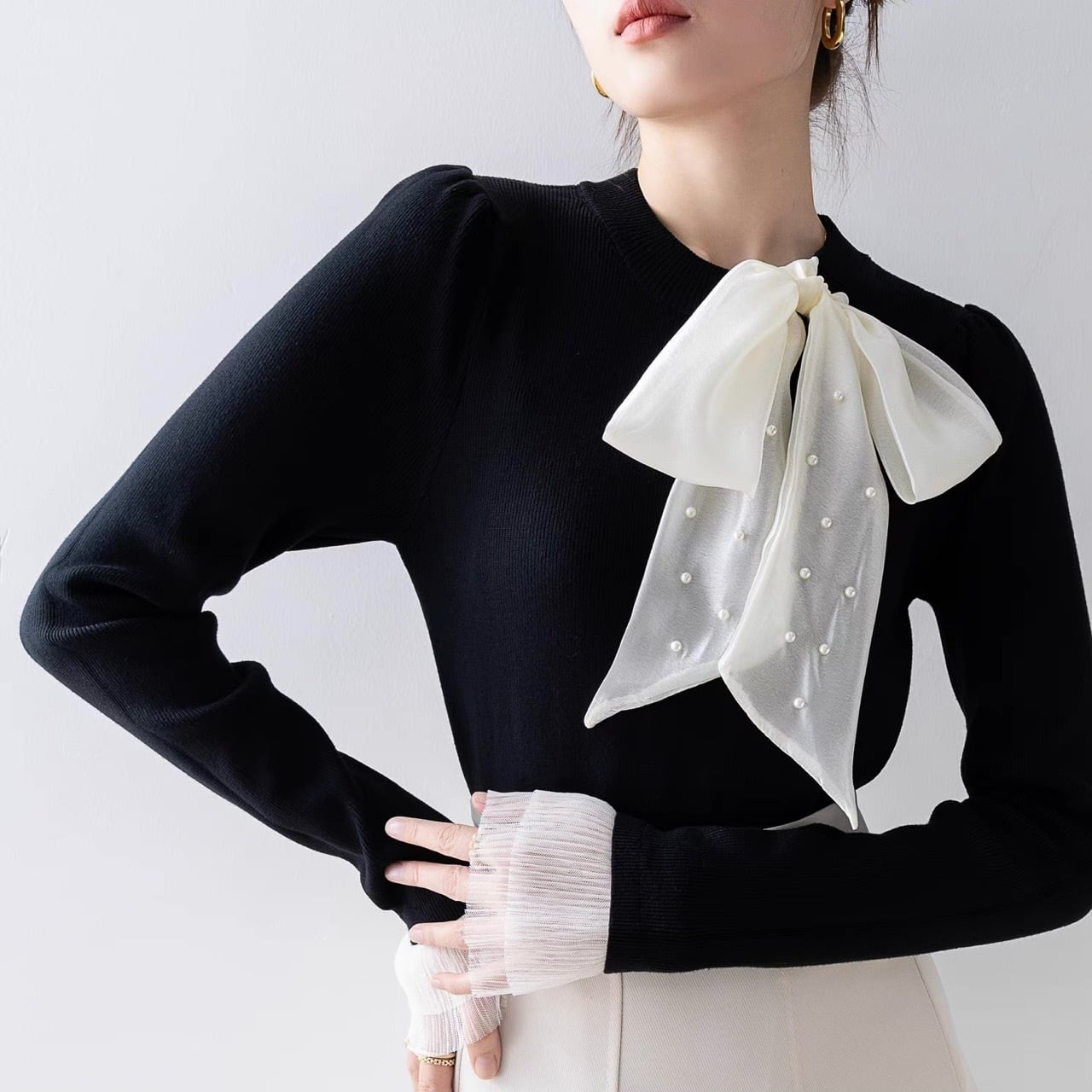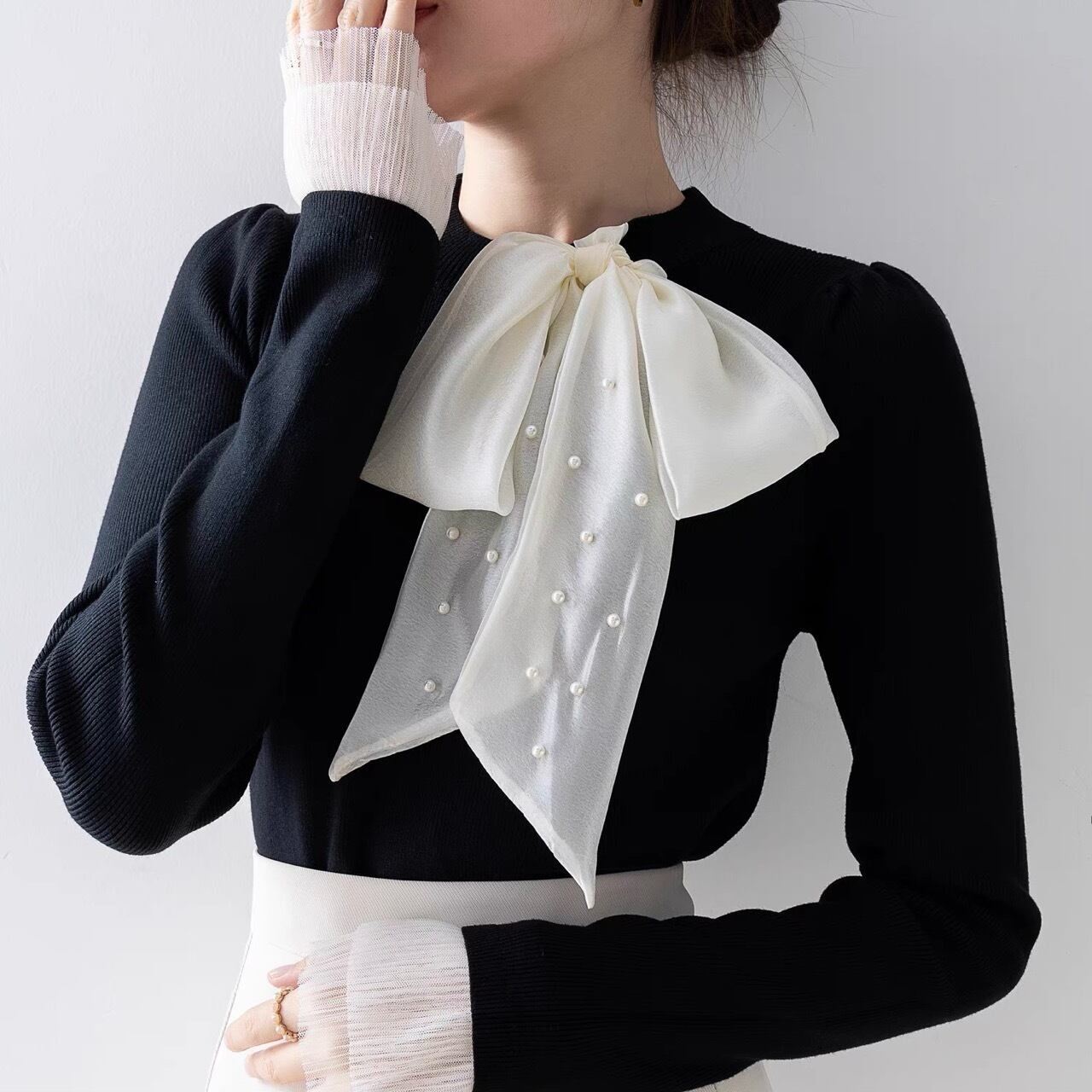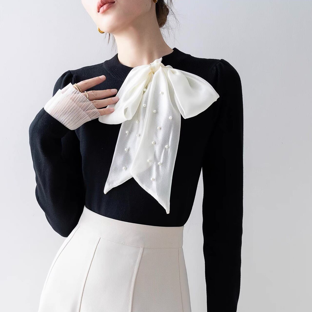 優雅なパールボウタイとフリルスリーブが特徴のトップスです。