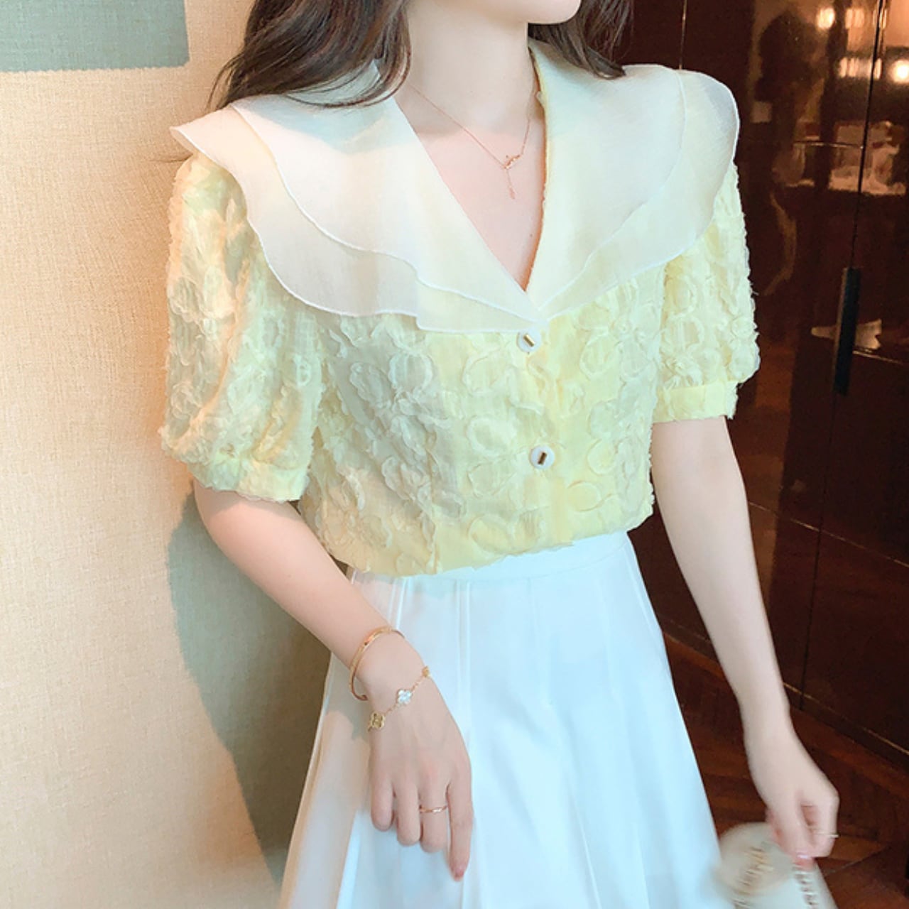 ワイドカラー フラワーモチーフ シフォン ブラウス_k116