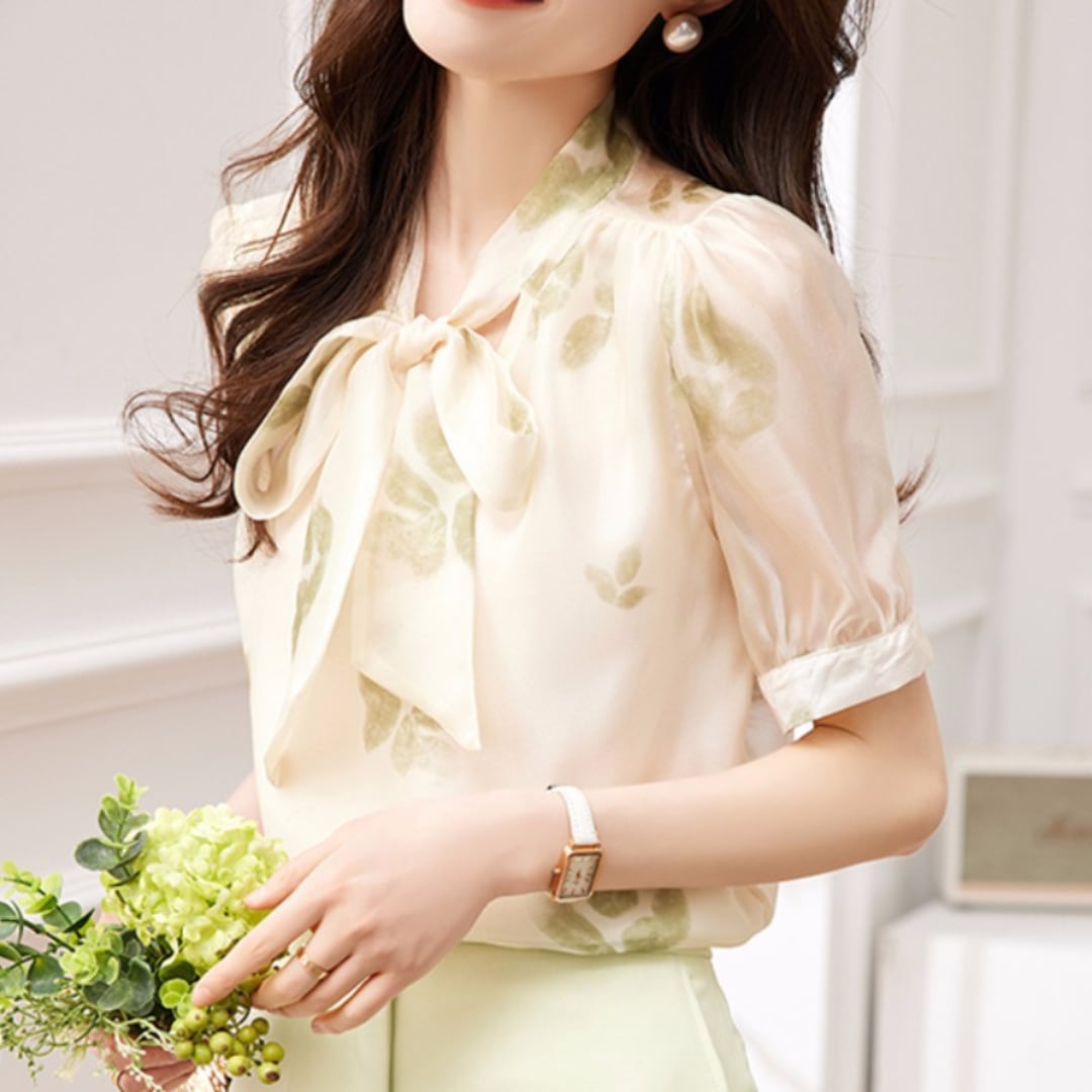 やわらかなクリーム色の生地に散りばめられた上品な花柄が、女性の魅力を引き立てる一枚です。首元の大きなボウタイがフェミニンな印象を演出し、美しく着こなしていただけます。