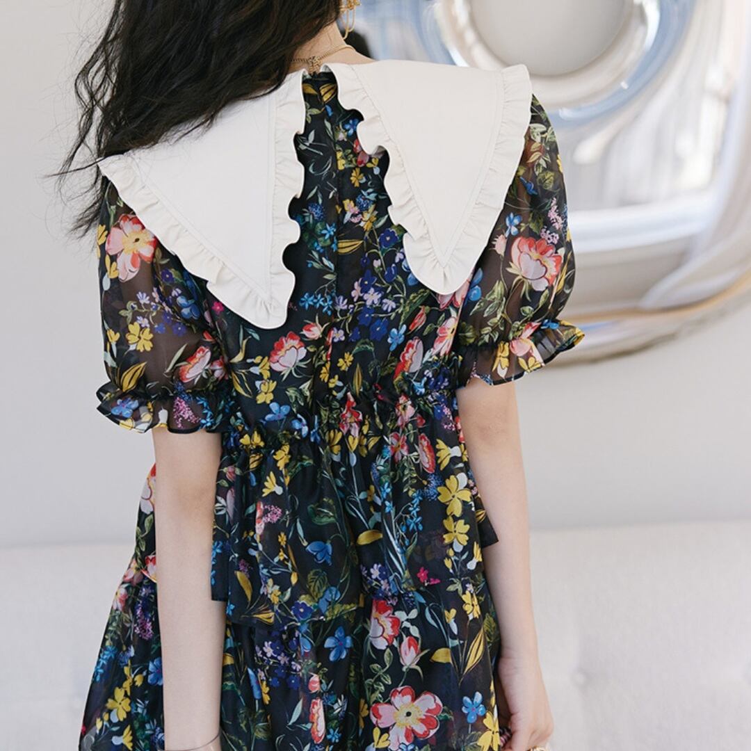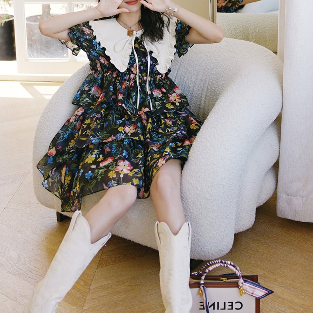 まるで秘密の花園から飛び出してきたような、カラフルな花柄がぱっと目を引くロマンティックワンピース♪ 真っ白なビッグカラーがきゅんっと可愛らしさをアップして、首元のリボンでりぼん結びすれば甘すぎない大人可愛いスタイルに。ふわりと広がるティアードスカートが歩くたびにひらひらと揺れて、まるで花びらが舞い踊るような軽やかな印象を演出します。ウエストマークでぎゅっと絞れるので、スタイルアップ効果も抜群です。