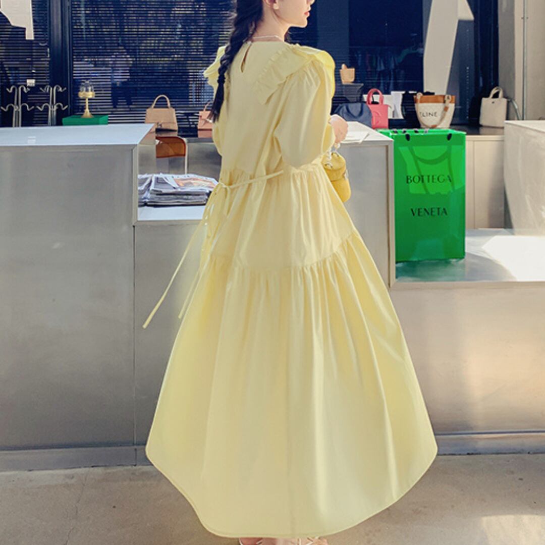 明るいイエローカラーが印象的な、ロマンティックなティアードワンピース。ふんわりと広がるボリューム袖と段々に重なったティアード仕様で、動くたびに美しいシルエットを描きます。ウエスト切り替えでスタイルアップ効果も抜群。軽やかな生地感で重くなりすぎず、春夏のお出かけにぴったりのデザインです。マキシ丈なので上品さも兼ね備えています。