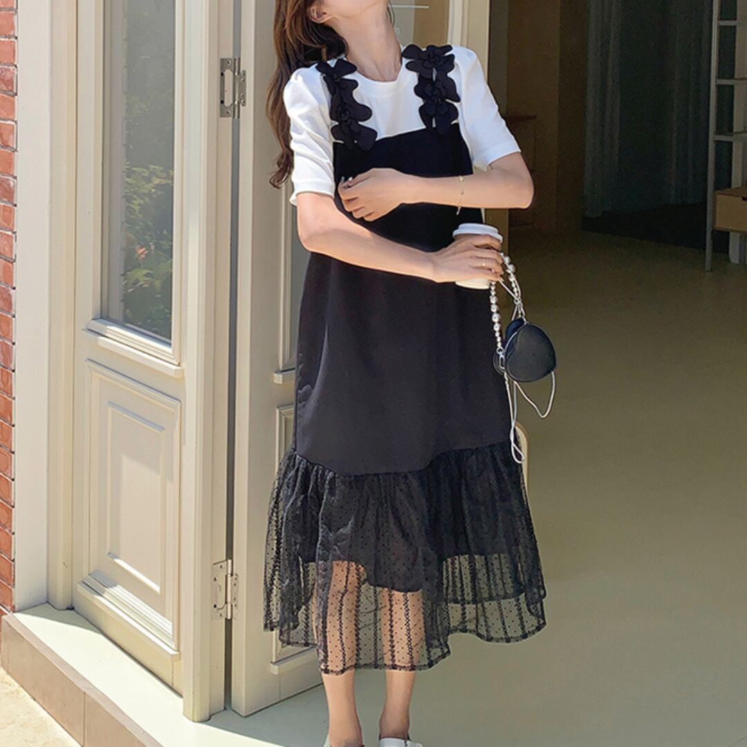 フェイク ツーピース フラワー ショルダー ワンピース_H111