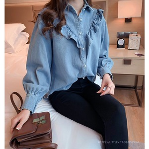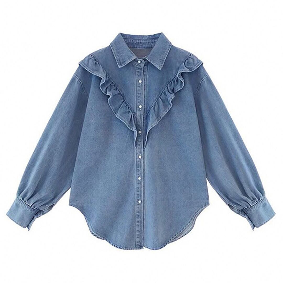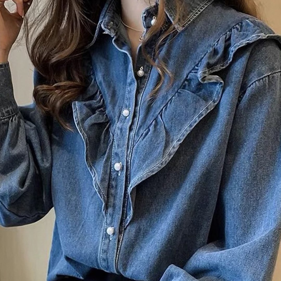 胸元と肩にたっぷりあしらわれたフリルがひらり〜と華やかなデニムシャツ♡ 袖口のギャザーデザインがふんわりと上品で、カジュアルなデニム素材なのにとってもエレガントな印象に。パールボタンがちらりと光って、コーディネートのアクセントにもなります。程よいオーバーサイズで体型カバーも叶う、嬉しいデザイン◎ 優しいカラーで、お顔周りもぱっと明るく見せてくれます!