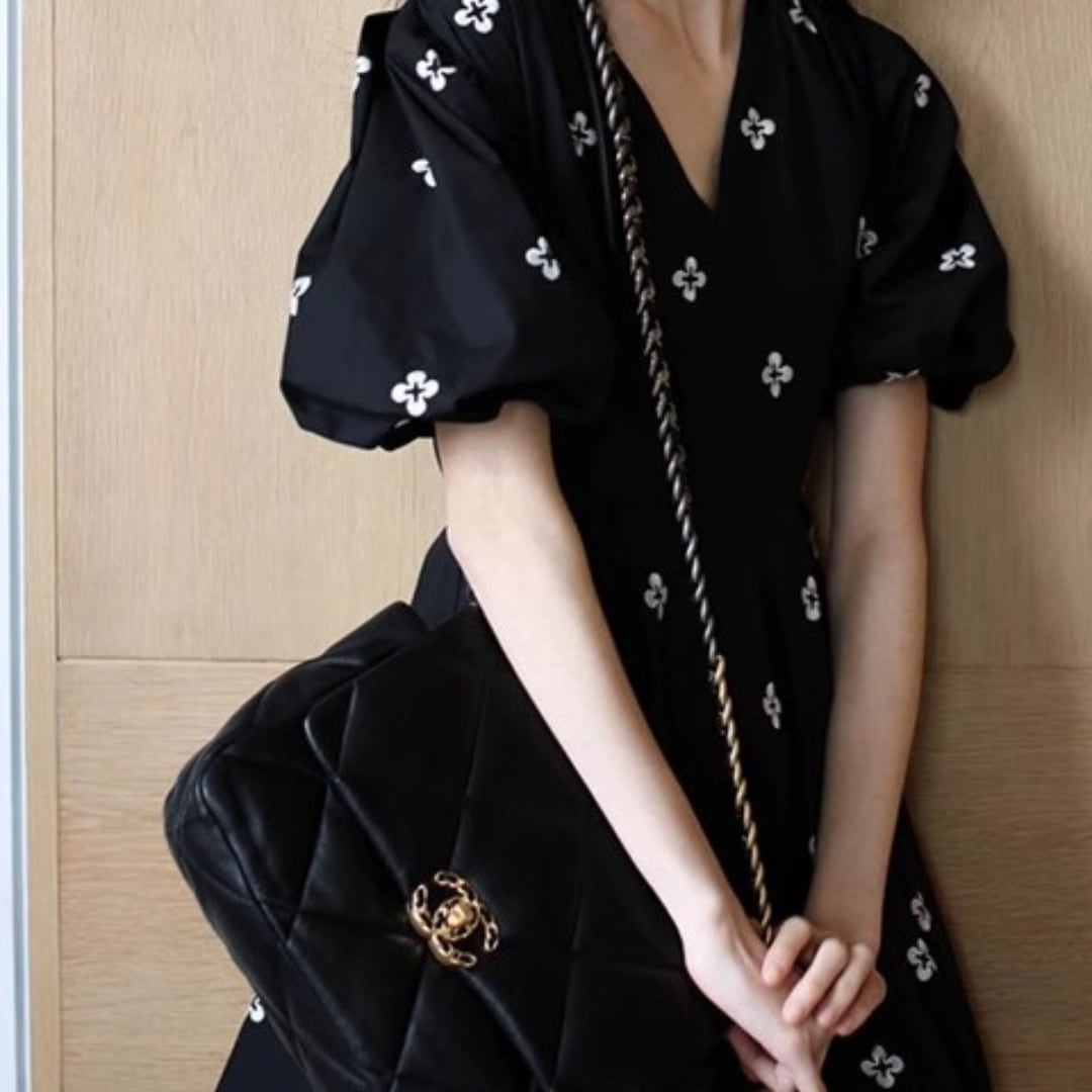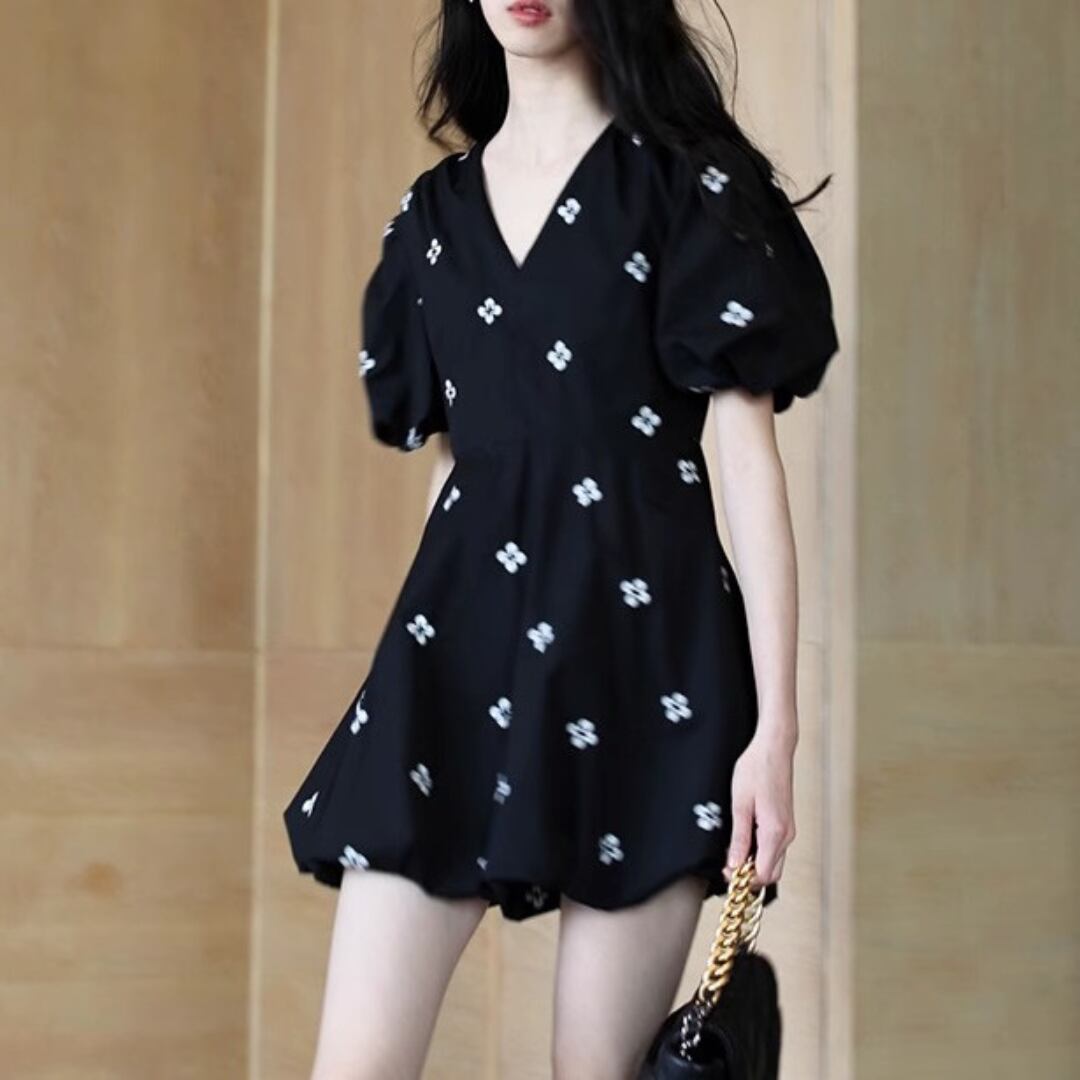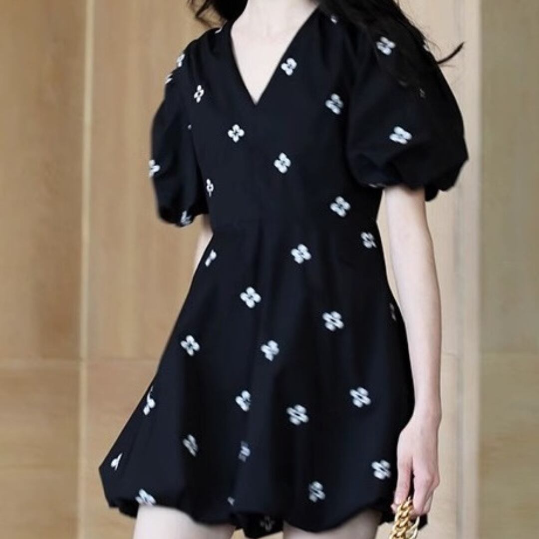 深いブラックに白い小花がぽつぽつと咲く、上品で可愛らしいワンピース。ふんわりとしたパフスリーブがとってもキュートで、袖口はきゅっと絞られたバルーンシルエット。すっきりとしたVネックラインで顔まわりをぱっと明るく見せてくれます。ウエストはぎゅっと絞られたフィット&フレアデザインで、スタイルアップ効果もばっちり!