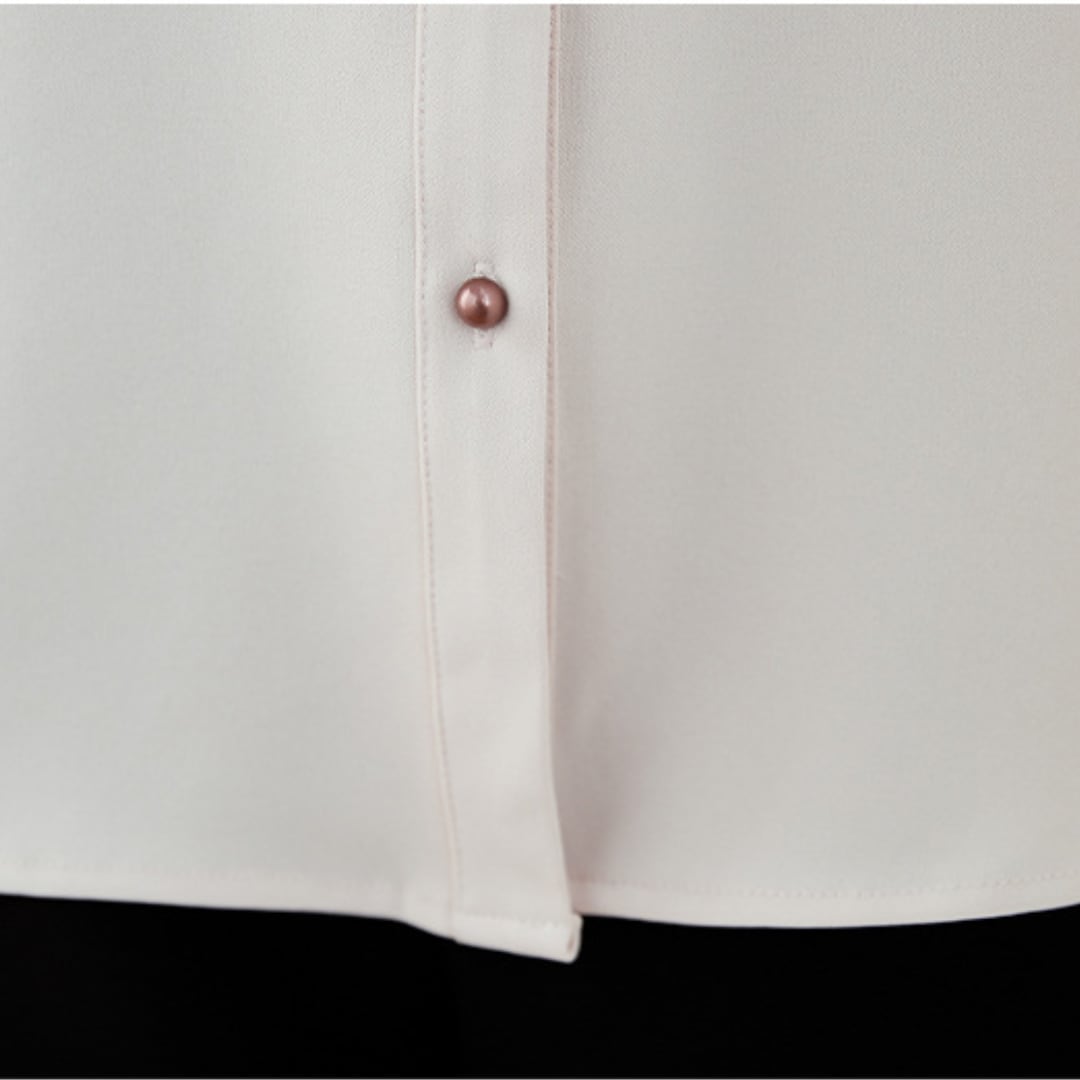 胸元のパールボタンがちょこんと並んで、エレガントさをプラス。袖はゆったりとしたバルーン袖で、腕まわりもすっきり見せてくれます。