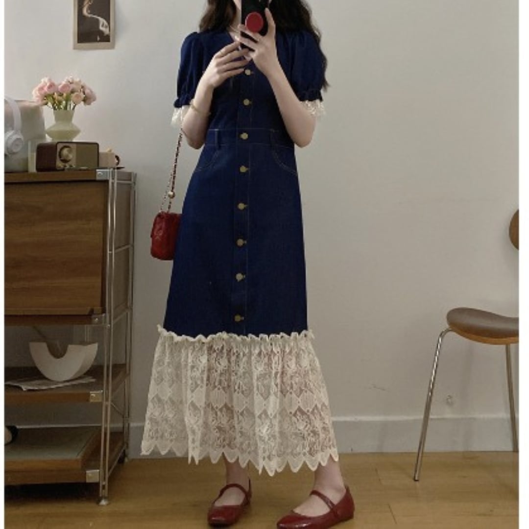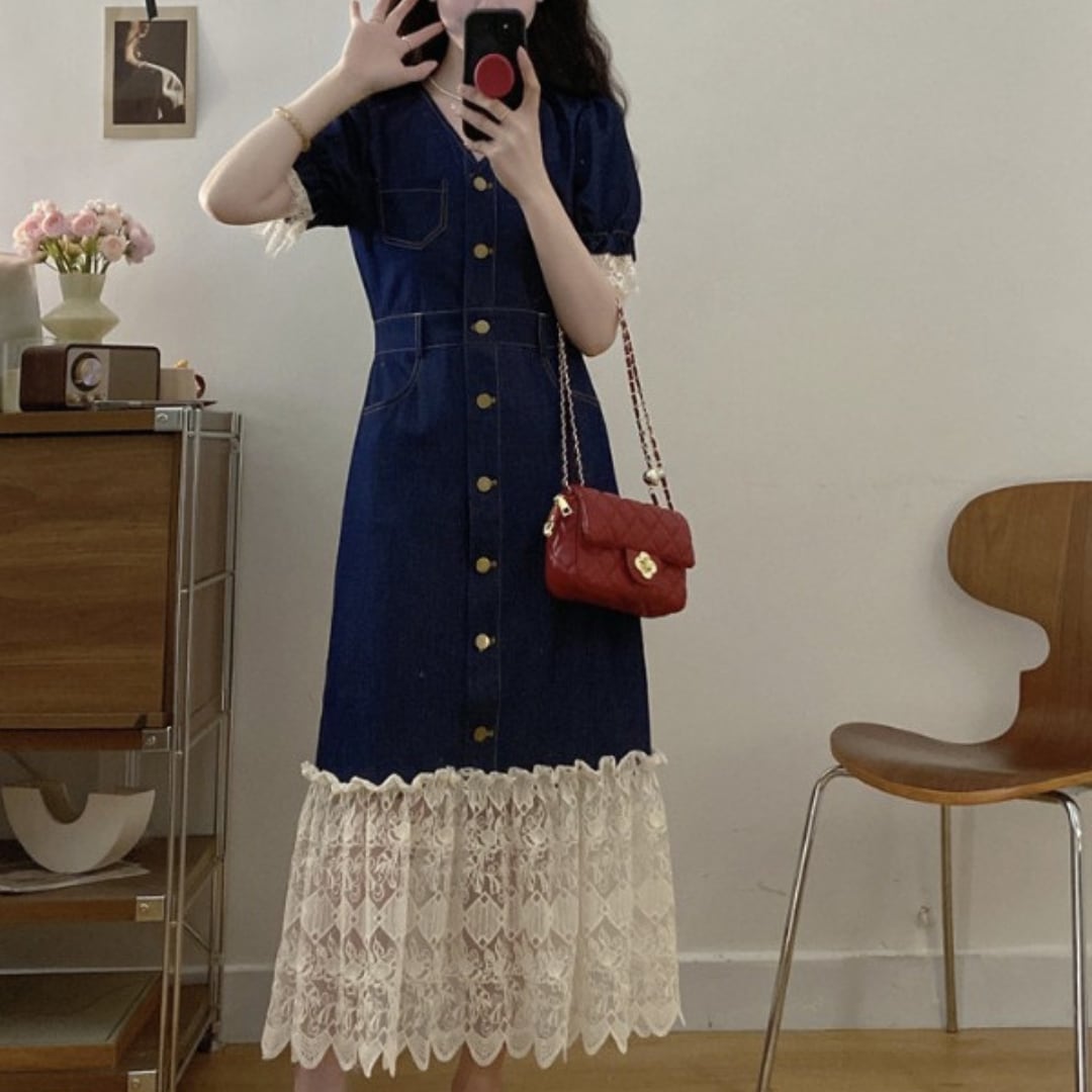 上品なデニム素材にふわりと広がる白レースの切り替えが、まるでお姫様みたいにロマンティック♡フロントのボタンがキラキラと輝いて、カジュアルなのに上品見えが叶います。袖口にはちらりとのぞく白レースがポイントに。ウエスト部分はきゅっと絞られたシルエットで、スタイルアップ効果も抜群!
