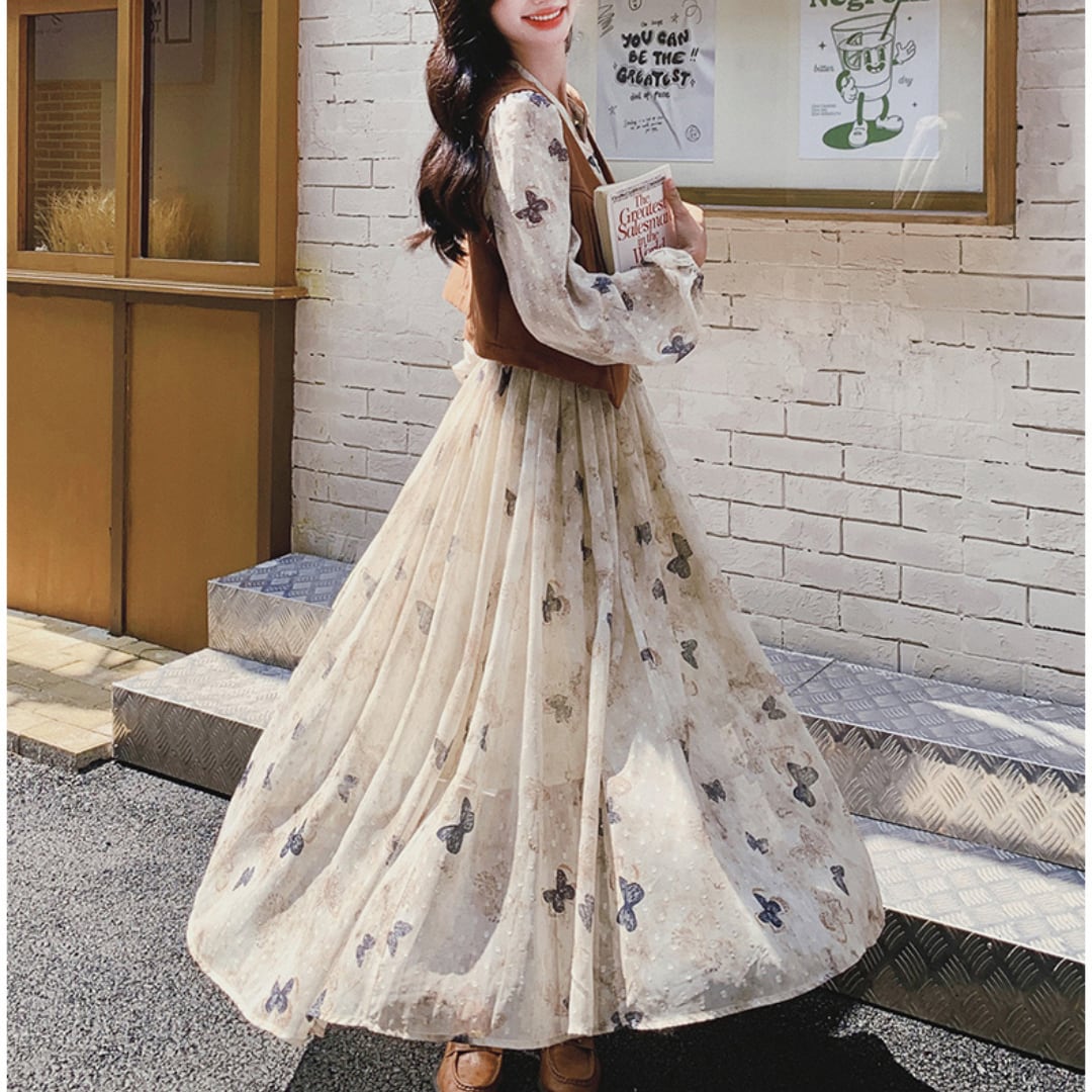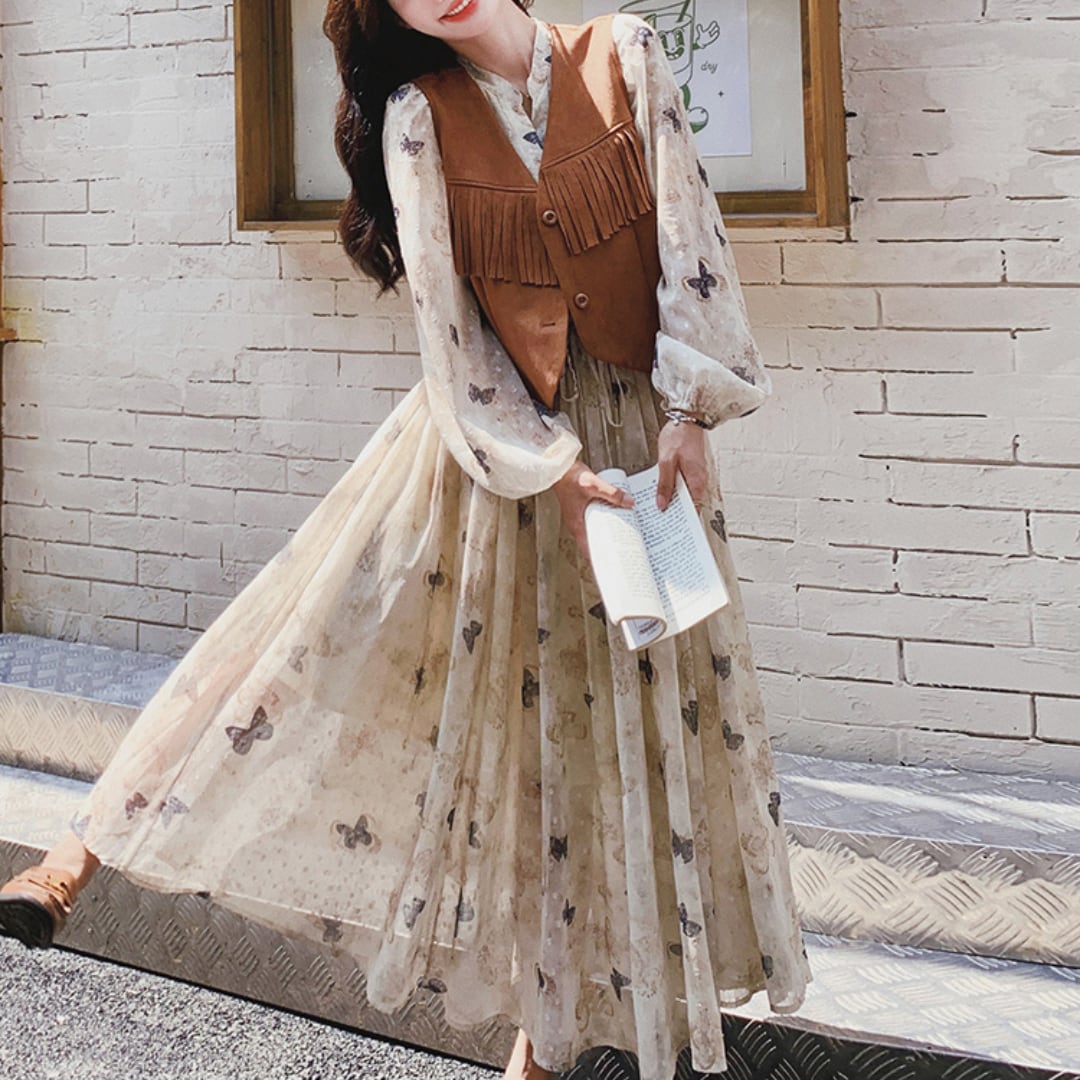ひらり♪と舞う蝶々柄のロングワンピースに、しっとり♡とした質感のスエードベストがセットになった大人可愛いアイテム。クリーム色のベースに散りばめられた小さな蝶々モチーフが、ふわり♪と女性らしさを演出します。