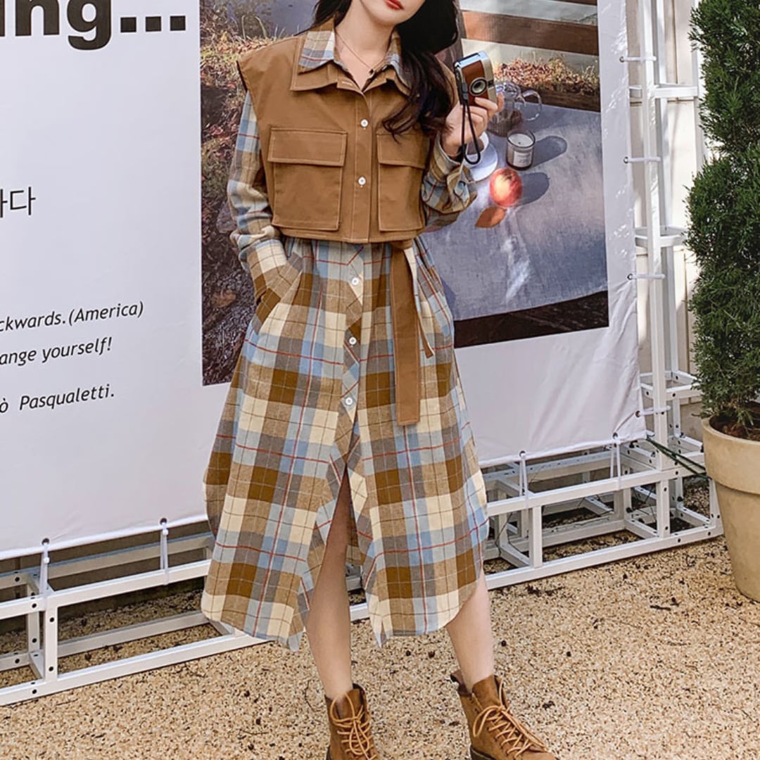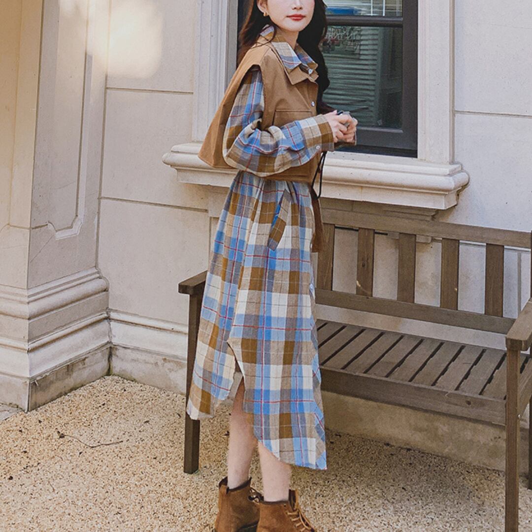 ■【セット】チェック シャツ ワンピース × レトロ デザイン ベスト_H147