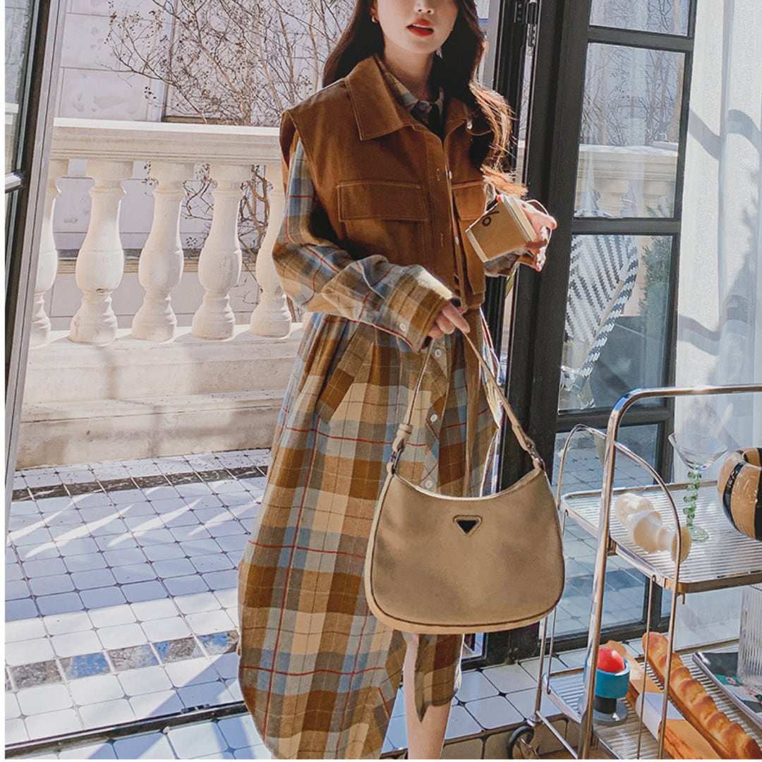 きゅん♡とするチェック柄のシャツワンピースと、かっこいいブラウンベストの最強コンビ!シャツワンピは程よいAラインでふわり~っと広がって、大人の可愛らしさを演出してくれます。ベストをオン♪すればたちまちメリハリのある洗練スタイルに変身。袖をくしゅっ♪とまくれば、こなれ感もばっちりです。