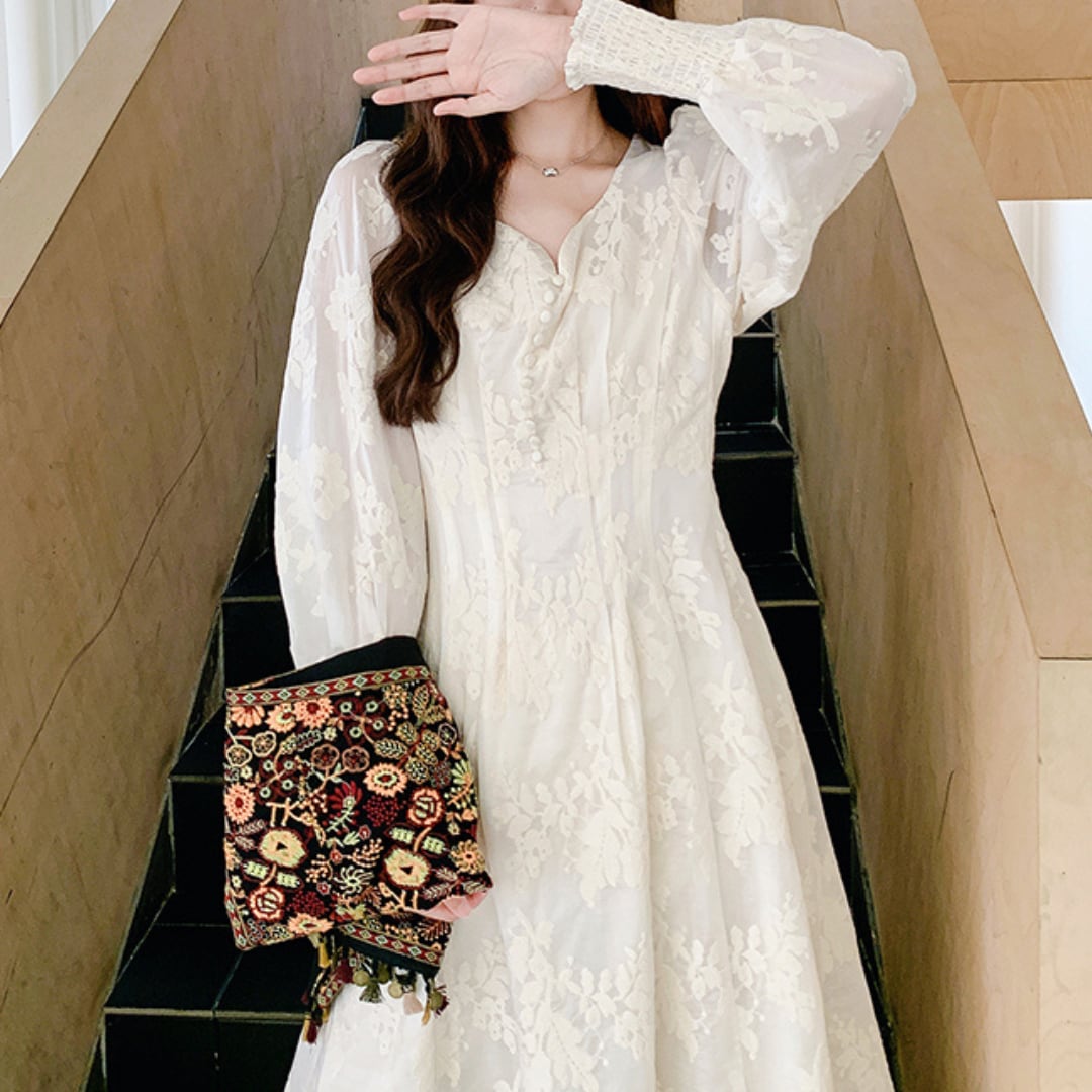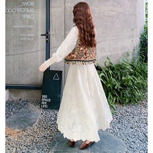 ひらり~っと舞うような白レースのマキシワンピースに、ぱっと目を引く刺繍ベストをセット♪ワンピースは袖口がきゅっと絞られたバルーンスリーブで、上品な甘さをプラス。ベストは色とりどりの花柄刺繍にタッセルがゆらゆら揺れて、まるで物語の主人公みたいな特別感たっぷりのデザインです。