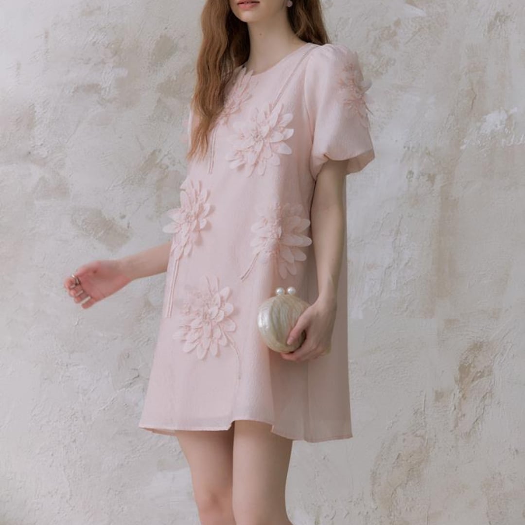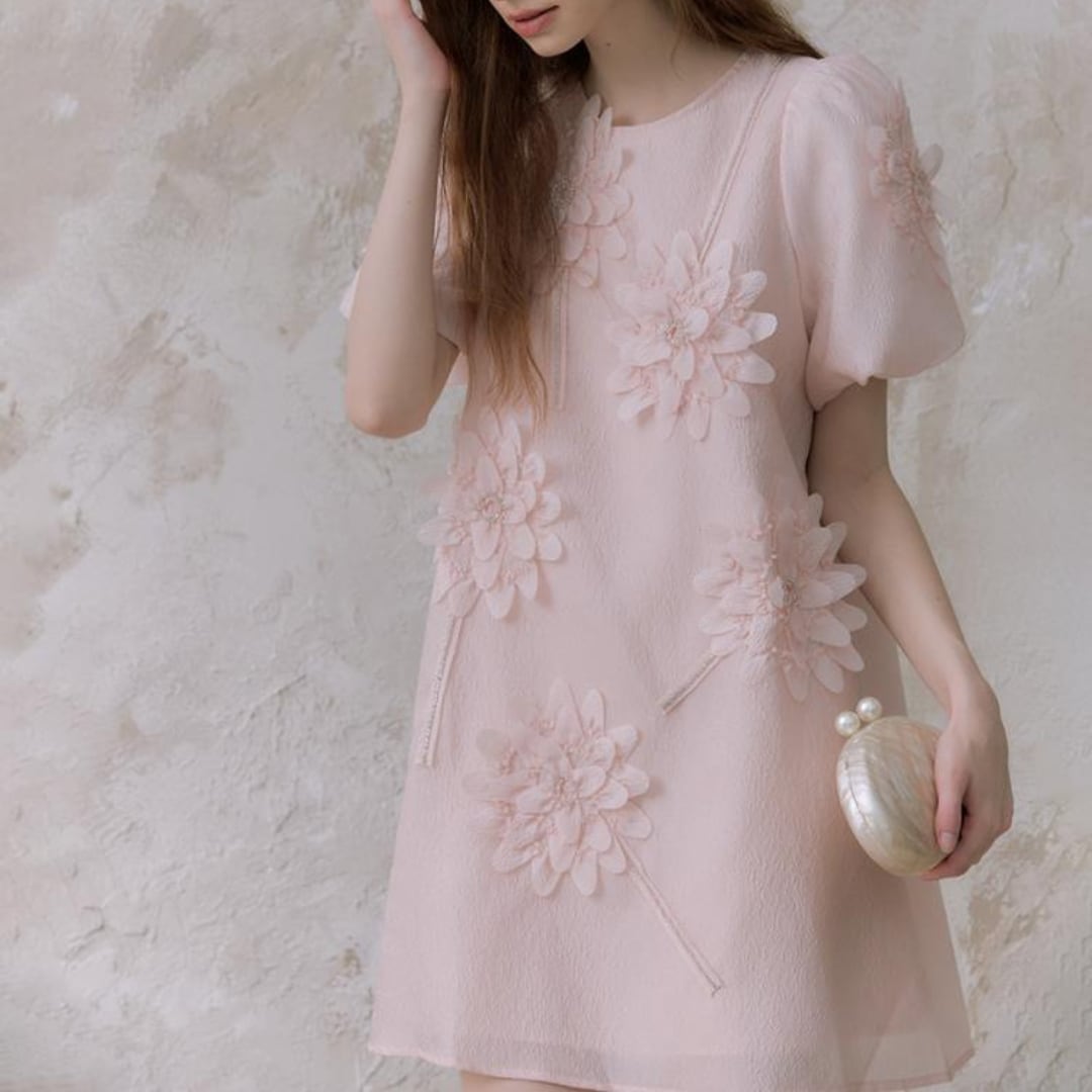 やわらかなピンクカラーがふんわりと優しい印象を与える、とっておきのワンピース♪立体的なお花の刺繍がぽんぽんと散りばめられて、まるで花畑を歩いているような華やかさです。シアー素材の透け感が軽やかで、重くなりがちな刺繍デザインもすっきりと上品に仕上がっています。半袖のゆったりシルエットで、二の腕もさらりとカバー。膝丈の絶妙な長さで、きちんと感もしっかりキープします♡