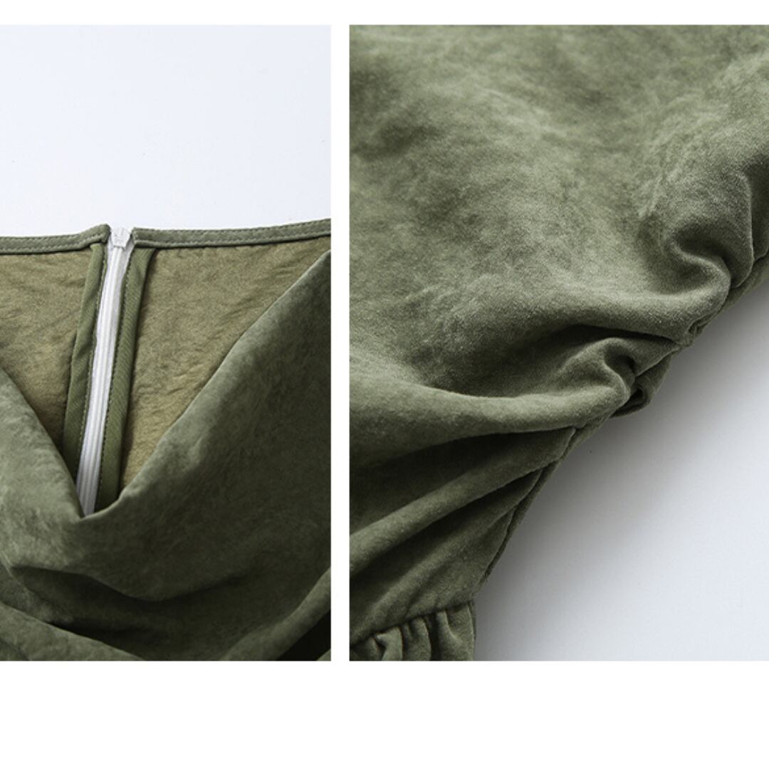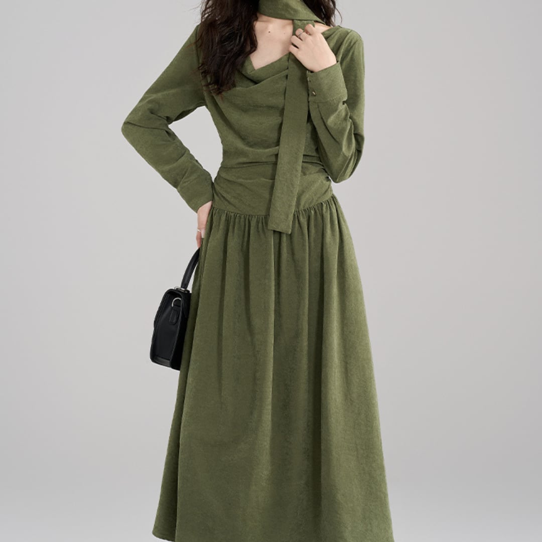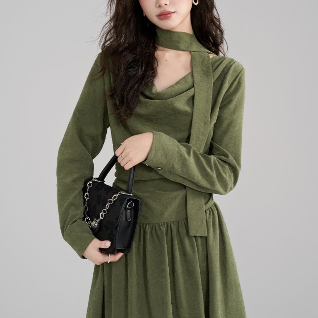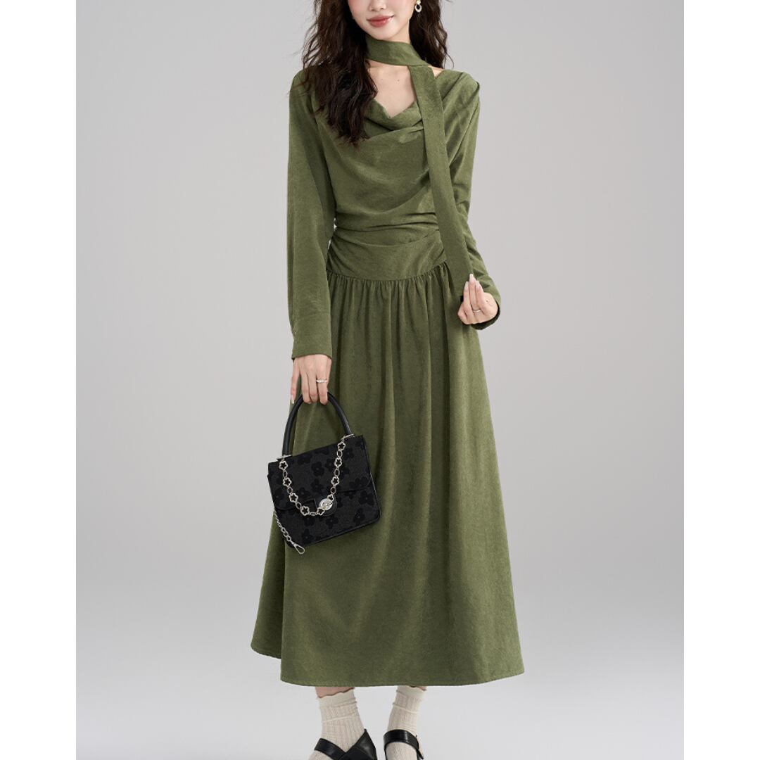 しっとり♪と落ち着いたオリーブグリーンが大人の魅力を引き立てる、エレガントなワンピース。コルセット風のトップスがきゅっ♡とウエストマークして、美しいシルエットを演出します。取り外し可能なショールは、ふわり~と肩に羽織ったり、首元にくるり♪と巻いたりと3wayで楽しめる優れもの。裾にかけてひらひら~と広がるティアードスカートが、歩くたびに揺れて上品な印象に。