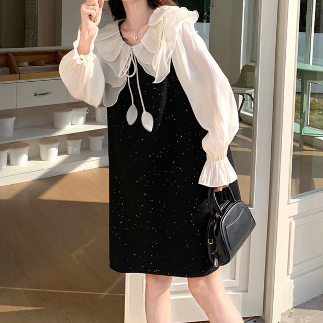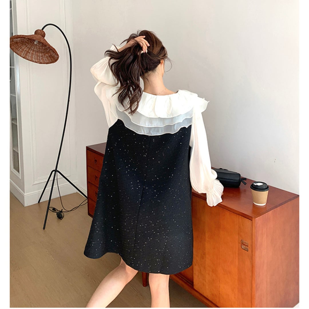 まるで星空のようにきらきら輝くドット柄のミニワンピースに、ふんわりシアーブラウスが一体になったフェイクツーピースデザイン♡ 胸元のリボンをくるりと結べば、甘すぎない上品な印象に仕上がります。袖口のひらひらフリルが、腕を動かすたびにゆらゆら揺れて愛らしさをプラス!白と黒のモノトーンカラーで、大人女性にぴったりの洗練された印象です。