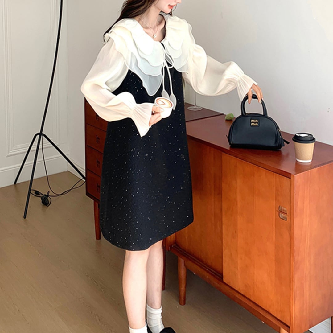 一枚でレイヤードスタイルが完成する優秀ワンピース♪ 足元はパンプスで上品に、スニーカーでカジュアルダウンしても素敵です。小さめのハンドバッグを合わせれば、旦那様とのカフェデートやショッピングにもぴったり。夜のお食事デートでは、きらめくドットが照明に映えて特別感たっぷりですよ◎
