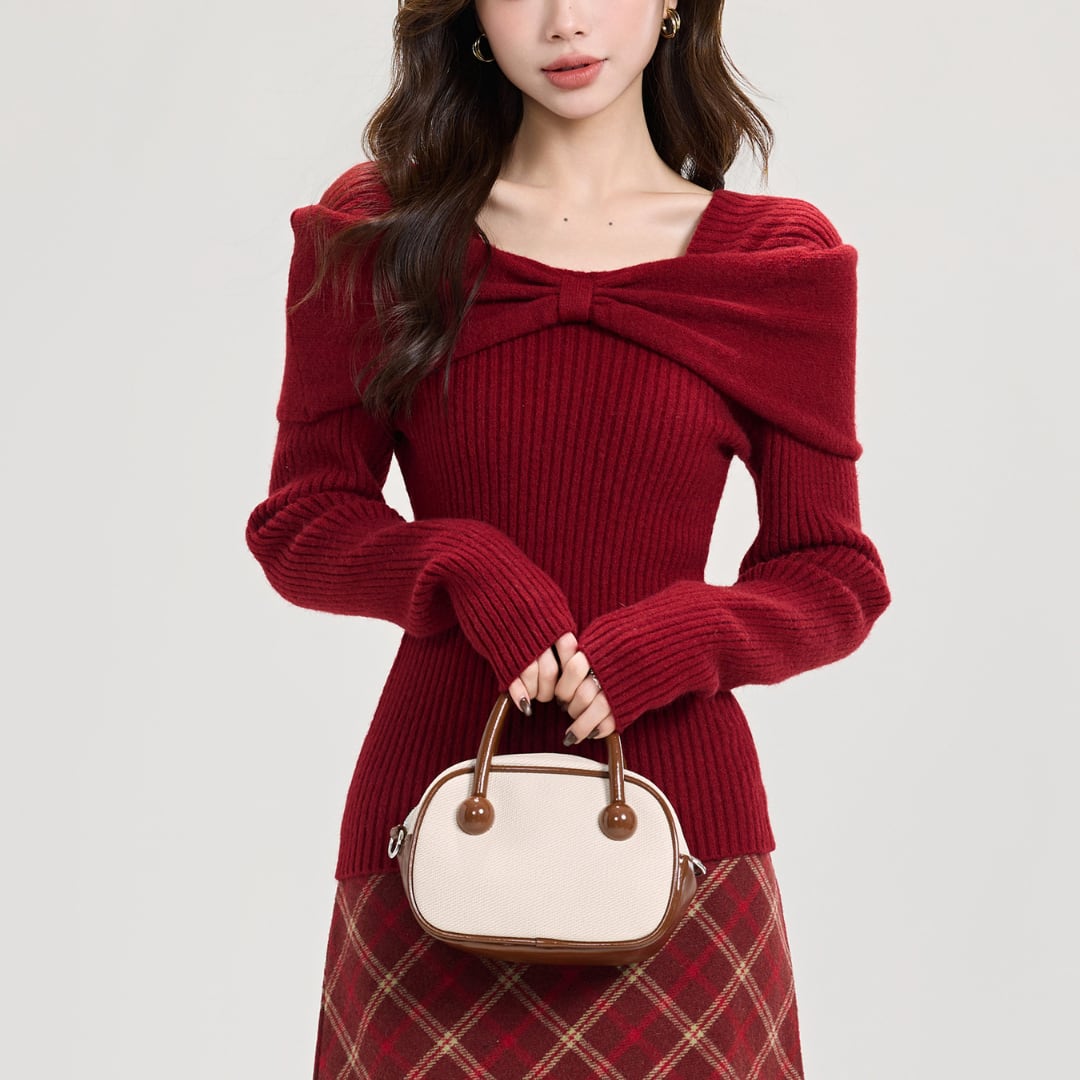 胸元でくるりんと交差したツイストデザインがとってもキュート♪ リブ編みのほっこり感と、肩見せの女性らしさが絶妙にマッチした一枚です。ふわりと落ちる肩のラインが、上品で大人可愛い印象を演出してくれます。程よいフィット感で体型をきれいに見せつつ、窮屈感のない着心地の良さも魅力的。