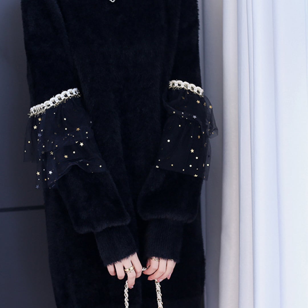 起毛感のあるニット素材で、ふわっと柔らかな質感。袖のチュールフリルは透け感があり、軽やかな印象に。星やビーズの装飾が、動きに合わせてきらめきます。
