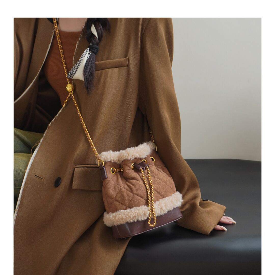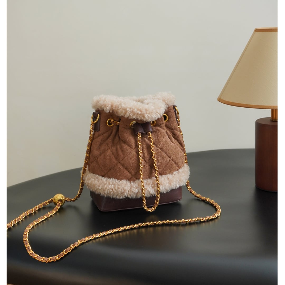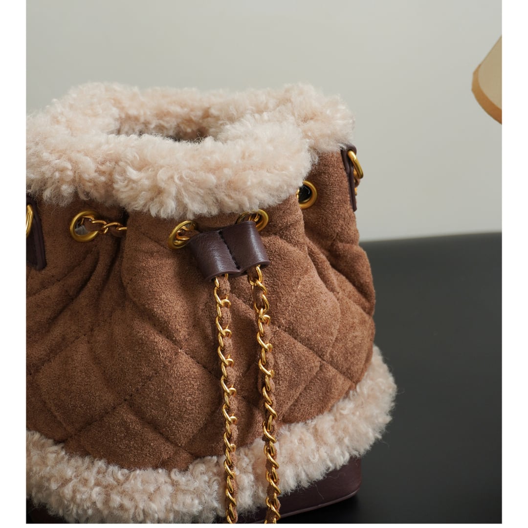 ふわふわのボアトリムとぷっくりキルティングが可愛らしい、冬のお出かけにぴったりな巾着型ミニバッグ。ブラウンのスエード調生地とダークブラウンのレザー調素材を切り替えた配色が、大人っぽさをプラスしてくれます。開口部と底部分にたっぷりとあしらったもこもこボアが、温かみのある印象に。コロンとしたフォルム感が持っているだけで気分を上げてくれます。