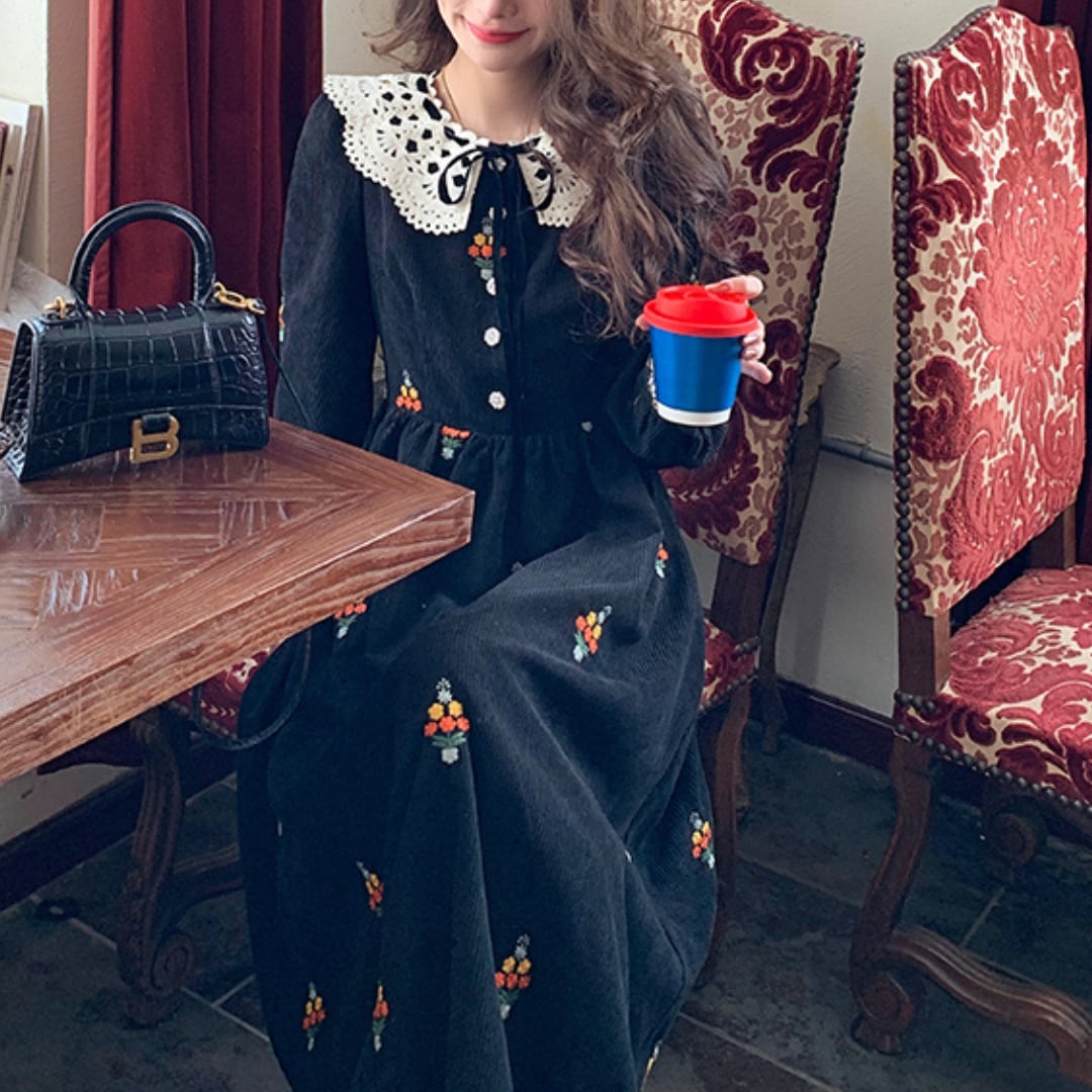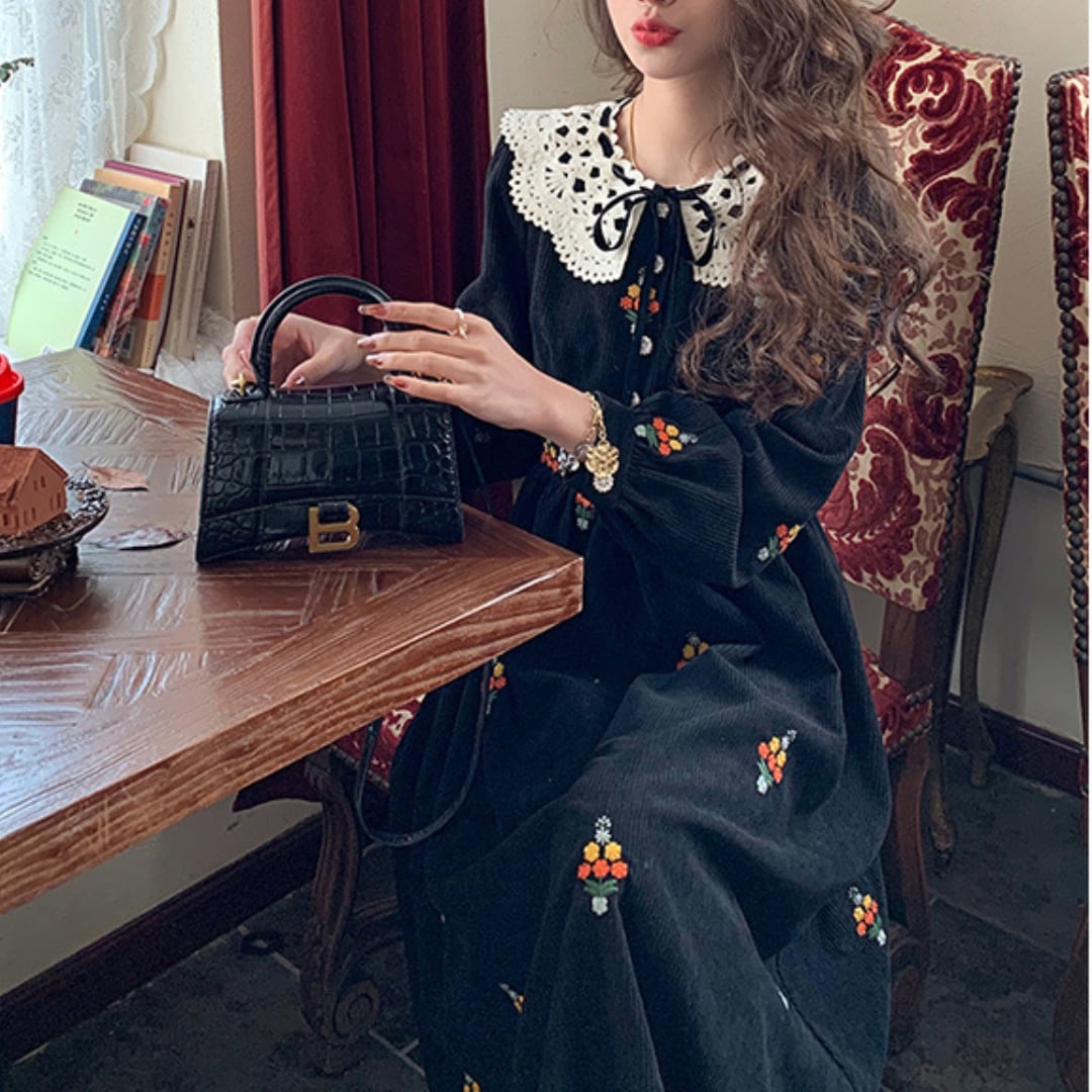 ふんわり柔らかなコーデュロイ生地に、ころころと可愛いカラフルな小花刺繍をちりばめた大人ガーリーなワンピース。襟元にはレース編みのスカラップ襟がたっぷりとあしらわれ、クラシカルで上品な印象に。襟元のリボンがアクセントになり、レトロで乙女心くすぐるデザインです。ウエストは自然なギャザーで女性らしいシルエットを演出し、ふわりと広がるスカートラインが優雅な雰囲気を醸し出します。長袖なので肌寒い季節にもぴったりで、一枚でコーディネートが完成する優秀アイテムです。