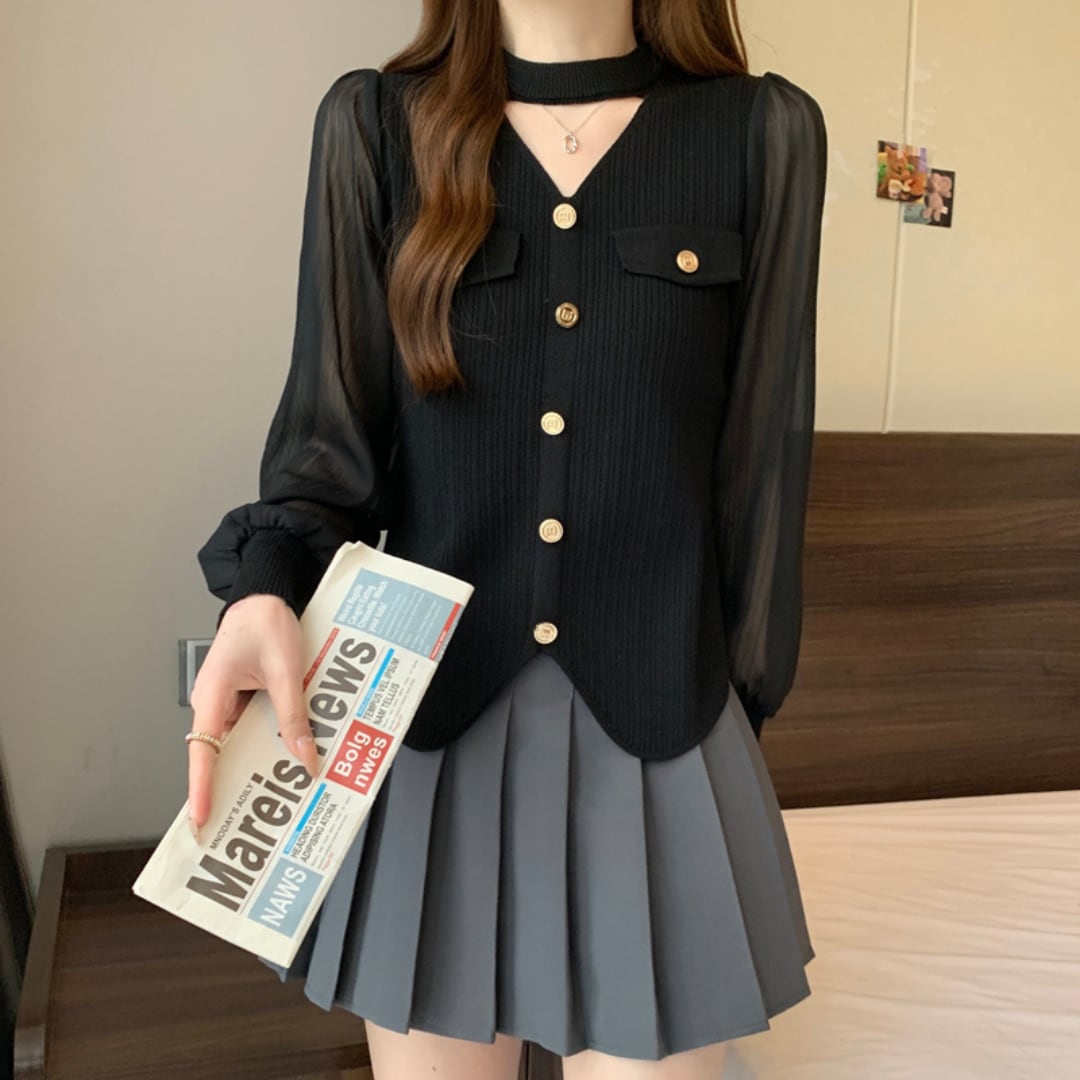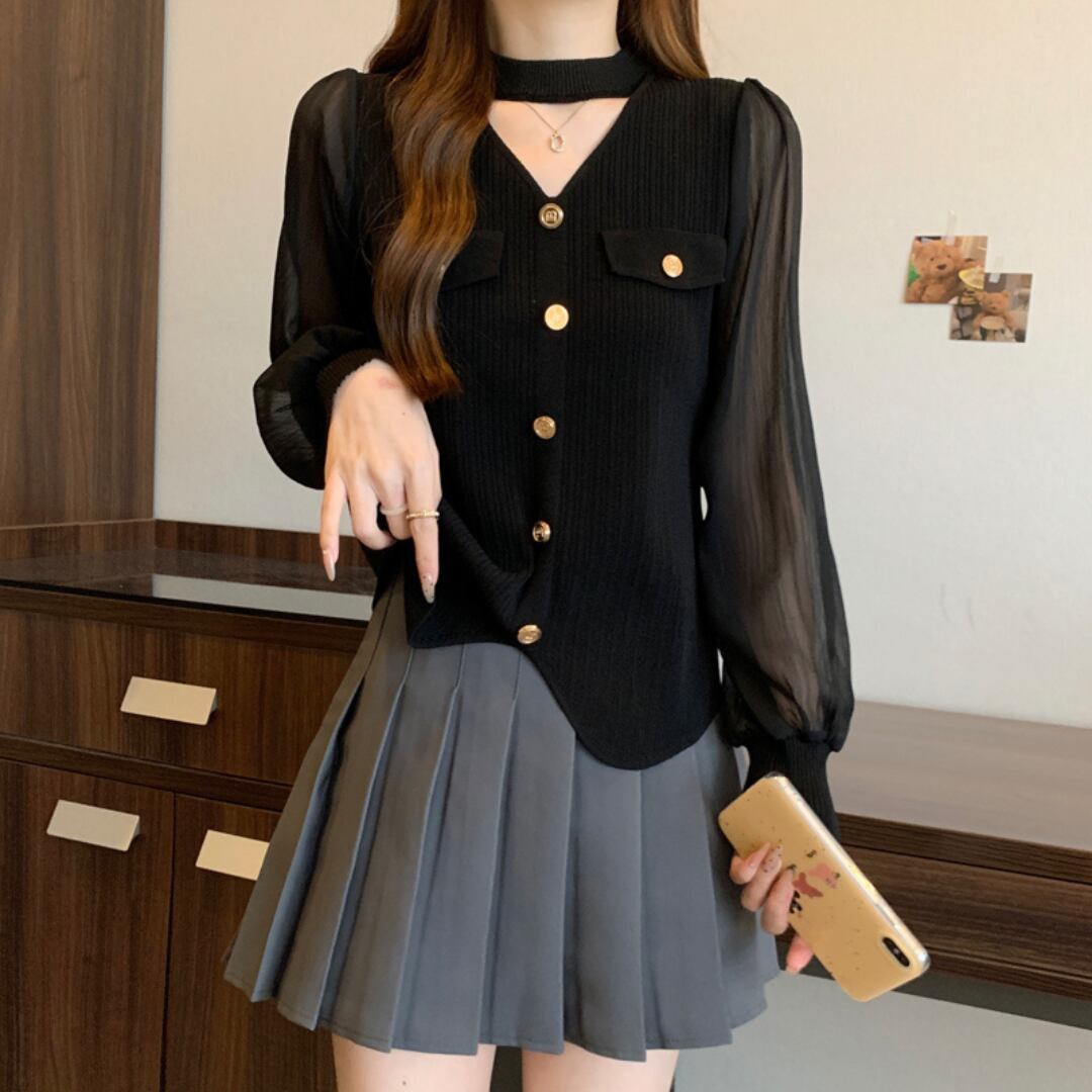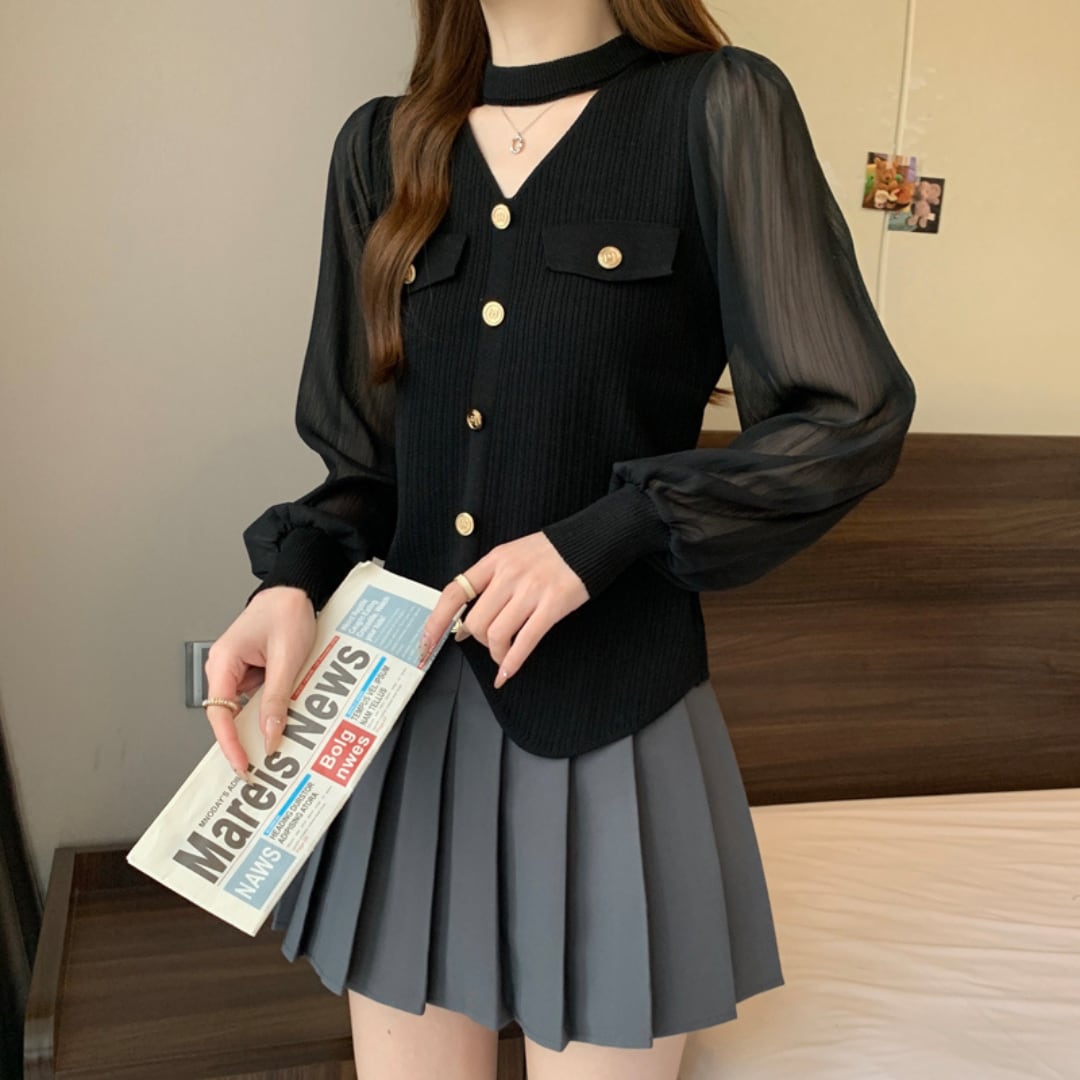 ふわりと透ける袖のシアー素材と、しっかりとしたリブニットのボディ部分がドッキングした、甘さと上品さを兼ね備えたトップス。首元はきゅっと締まったチョーカー風デザインに、すっきりとしたVネックの開きがエレガントな印象を演出します。フロントにはころんと可愛いゴールドボタンが並び、高級感をプラス。胸元のフラップポケットがアクセントになり、きちんと感も演出してくれます。袖口と裾はリブ仕様で、メリハリのあるシルエットに。透け感のある袖がふんわりと揺れて、動くたびに軽やかな印象を与えてくれる一枚です。