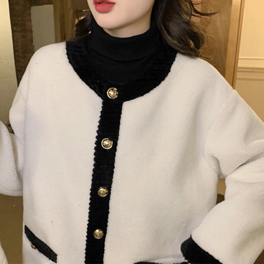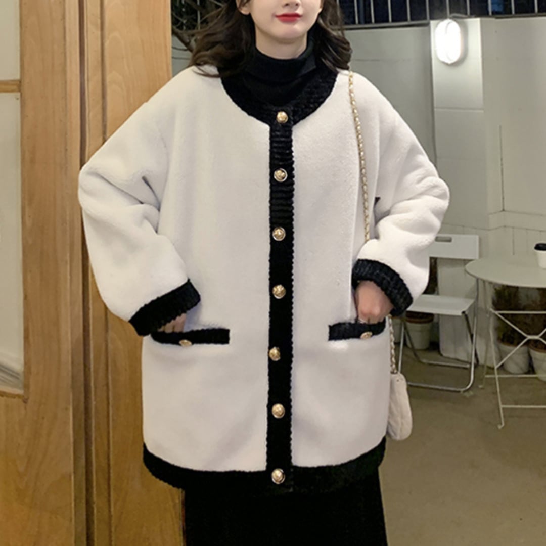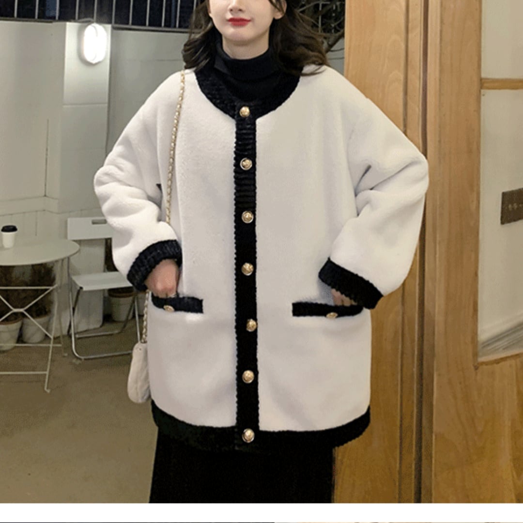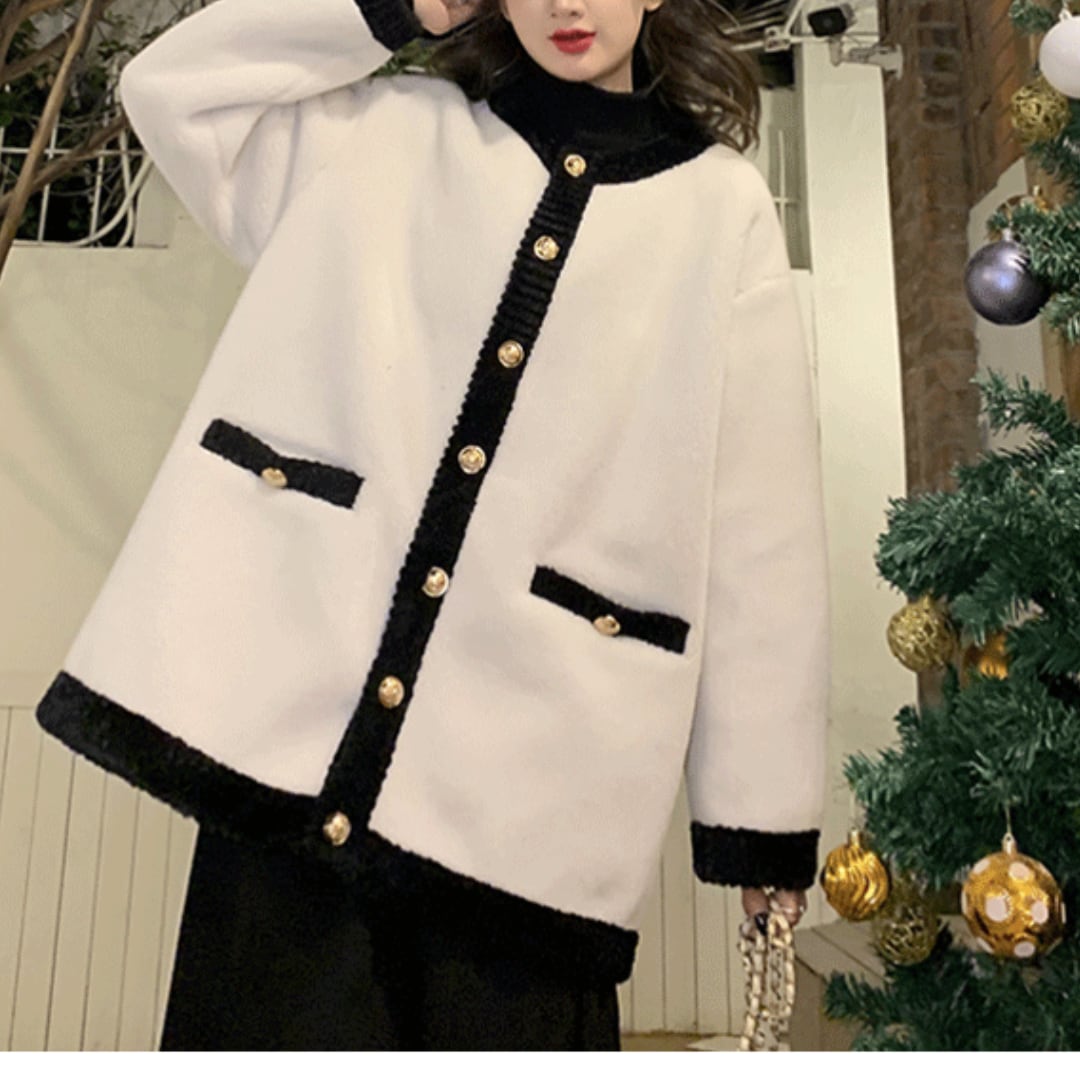 まるでパリのカフェが似合いそうな、クラシカルな雰囲気のボアジャケット。ふわふわの白×ブラックのバイカラーが、大人可愛いスタイルを演出します。きらりと光るゴールドボタンが、シンプルなデザインに上品なアクセントをプラス。袖口・裾・襟元のもこもこブラックトリミングが、メリハリのある印象に仕上げています。ゆったりとしたシルエットなので、体型カバーもばっちり◎ 着るだけでこなれ感が出る、大人のためのエレガントアウターです。