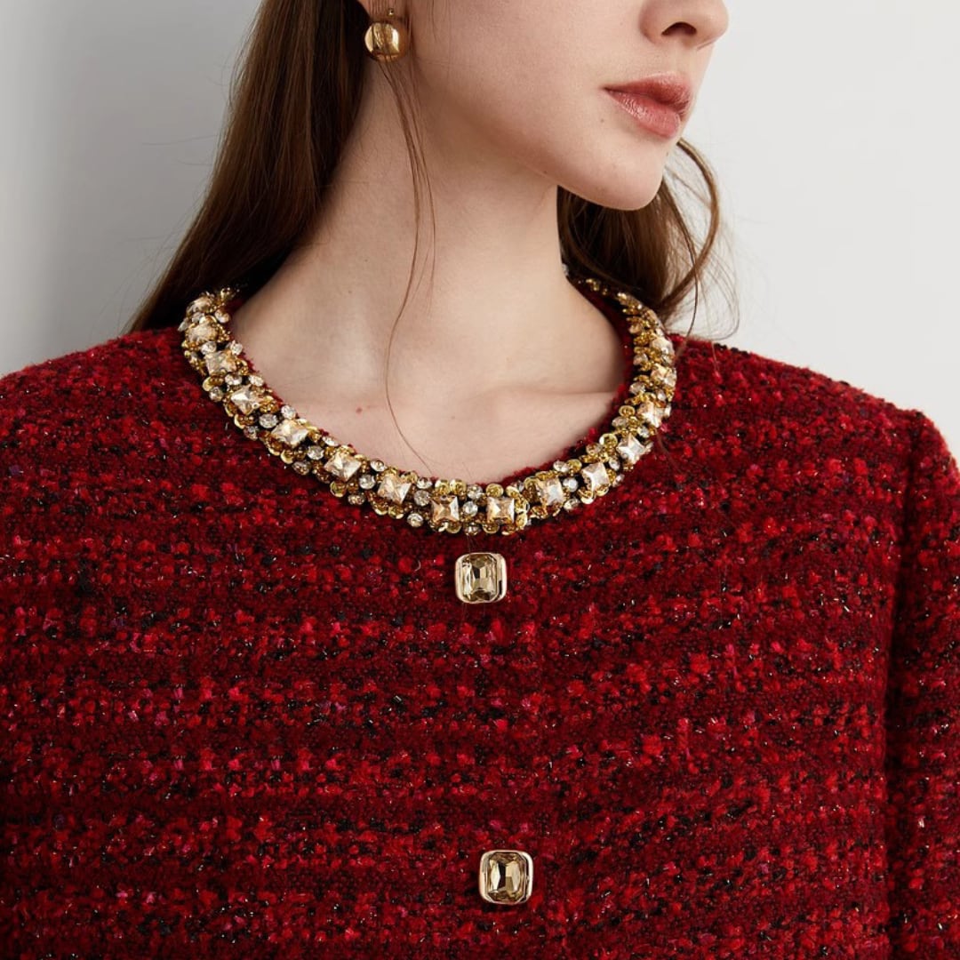 まるでパリのメゾンから届いたような、エレガントな深紅のツイードコートワンピース。首元にきらりと光るビジュー装飾のネックレスが、顔周りを華やかに演出します。きちんと感のあるノーカラーデザインで、大人の品格を演出。フロントは上品なボタン開きで、ウエスト位置にもきらきらのビジュー装飾がアクセントに。ポケット部分にもさりげなくビジューをあしらい、細部までこだわったデザインです。程よいミニ丈で、すらりと脚長効果も期待できます◎