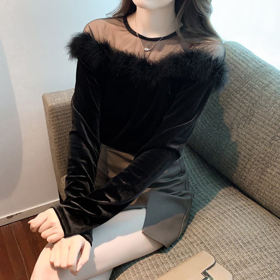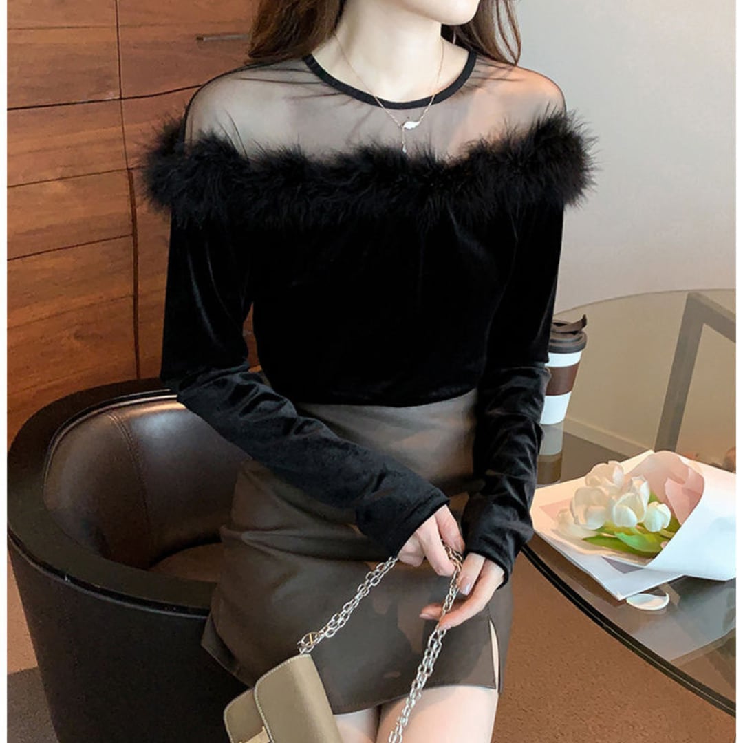 まるで夜のパーティーが似合いそうな、グラマラスなベルベットトップス。首元のシアーチュールが肌をほんのり透かし、大人の色気を演出します。胸元にはふわふわのフェザーファーをたっぷりとあしらい、ゴージャスな雰囲気に。つやつやとした光沢のあるベルベット素材が、動くたびにきらりと輝きます。袖口もベルベット仕様で、腕を華奢に見せてくれる効果も◎ 一枚でドラマティックなスタイリングが完成する、主役級のアイテムです。