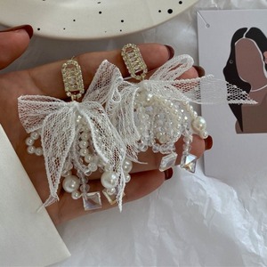 まるでウェディングドレスから抜け出したような、ロマンティックなピアス。ふんわりと軽やかなレースリボンが、顔を動かすたびにゆらゆら揺れて女性らしさを演出します。きらきらと光るクリスタルビーズと、ころころと可愛いパールがたっぷり♡ リボンの中央にはクリアなクリスタルチャームが揺れて、光を受けるたびにきらりと輝きます。耳元のビジュー部分もゴージャスで、横顔を美しく彩ってくれる存在感抜群のアクセサリーです。