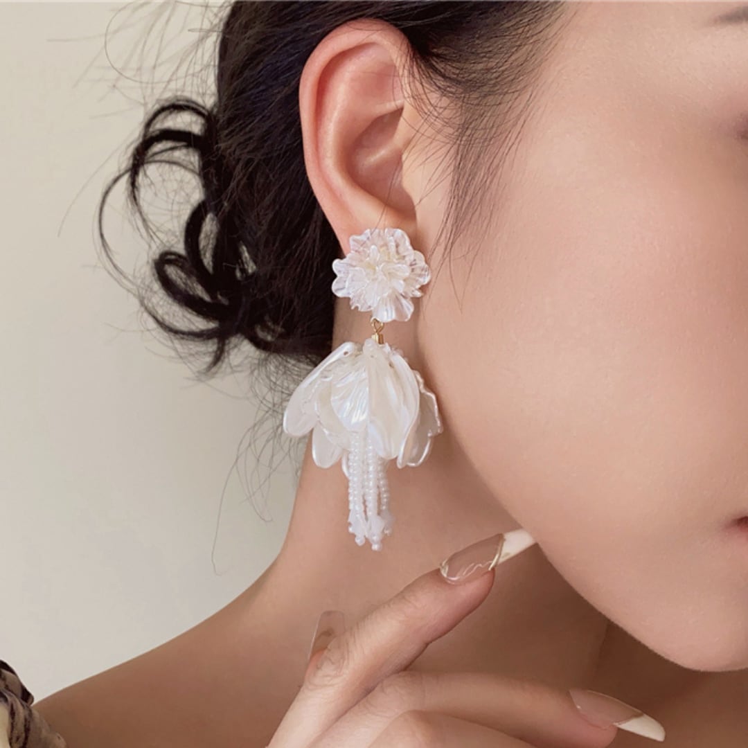 柔らかなタッセルと、しっかりとしたフラワーチャームを使用。タッセルの軽やかさは、耳元での動きを楽しむことができる絶妙なトーンで仕上げられています。また、フラワーチャームは高品質の素材を使用しており、色褪せしにくく、長くお楽しみいただけます。金具にはアレルギー対応の素材を使用しているため、敏感肌の方にも安心してご利用いただけます。