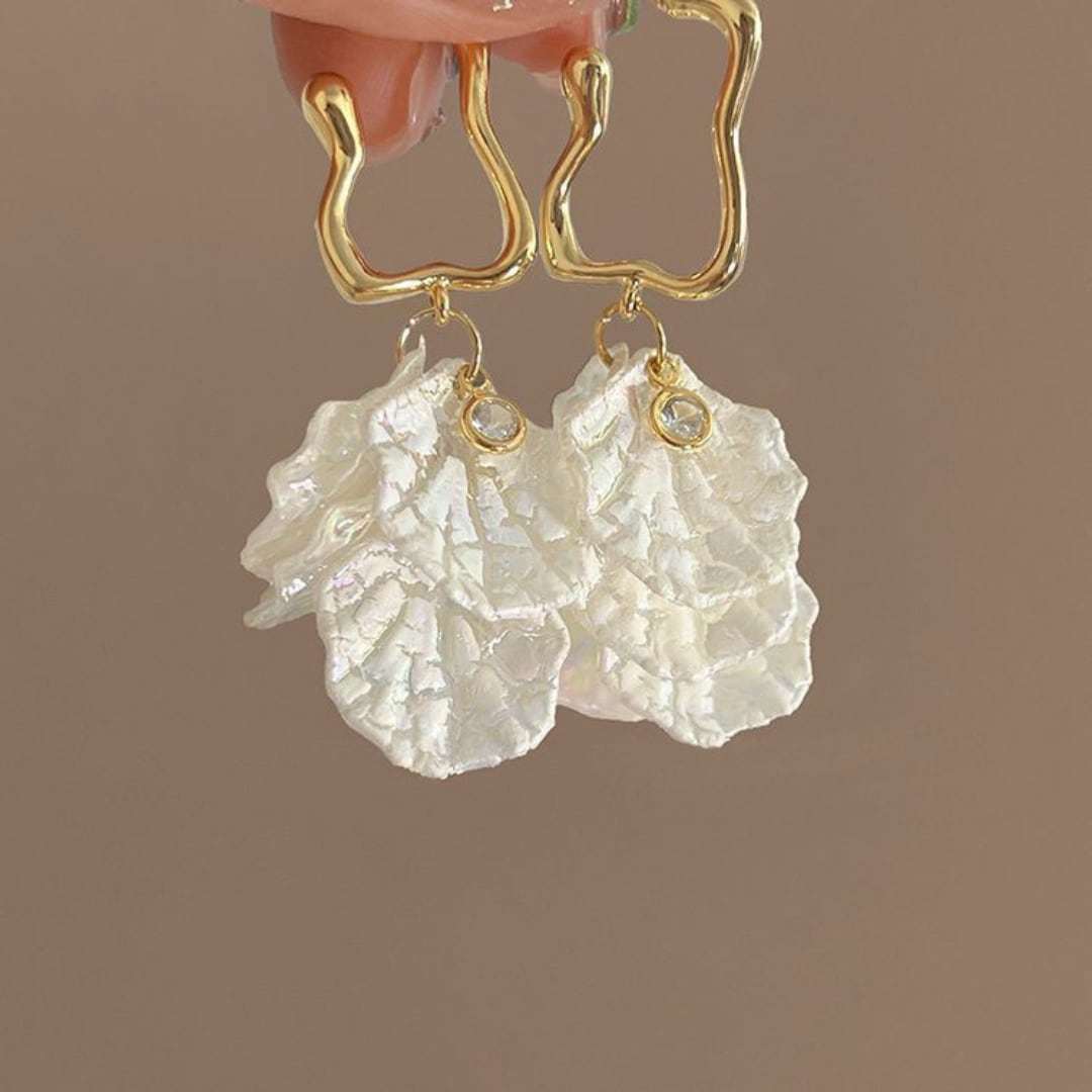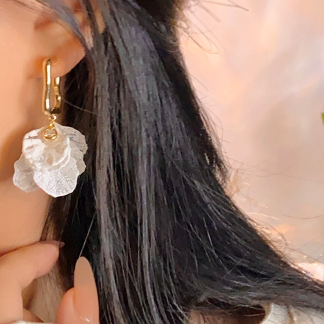 透明感のあるクリア樹脂で作られた花びらは、軽くて肌に優しい着け心地。ゴールドの金具は肌馴染みがよく、どんなコーディネートにもすっと馴染みます。揺れるたびにふわっと動くので、動きのある表情が楽しめます。