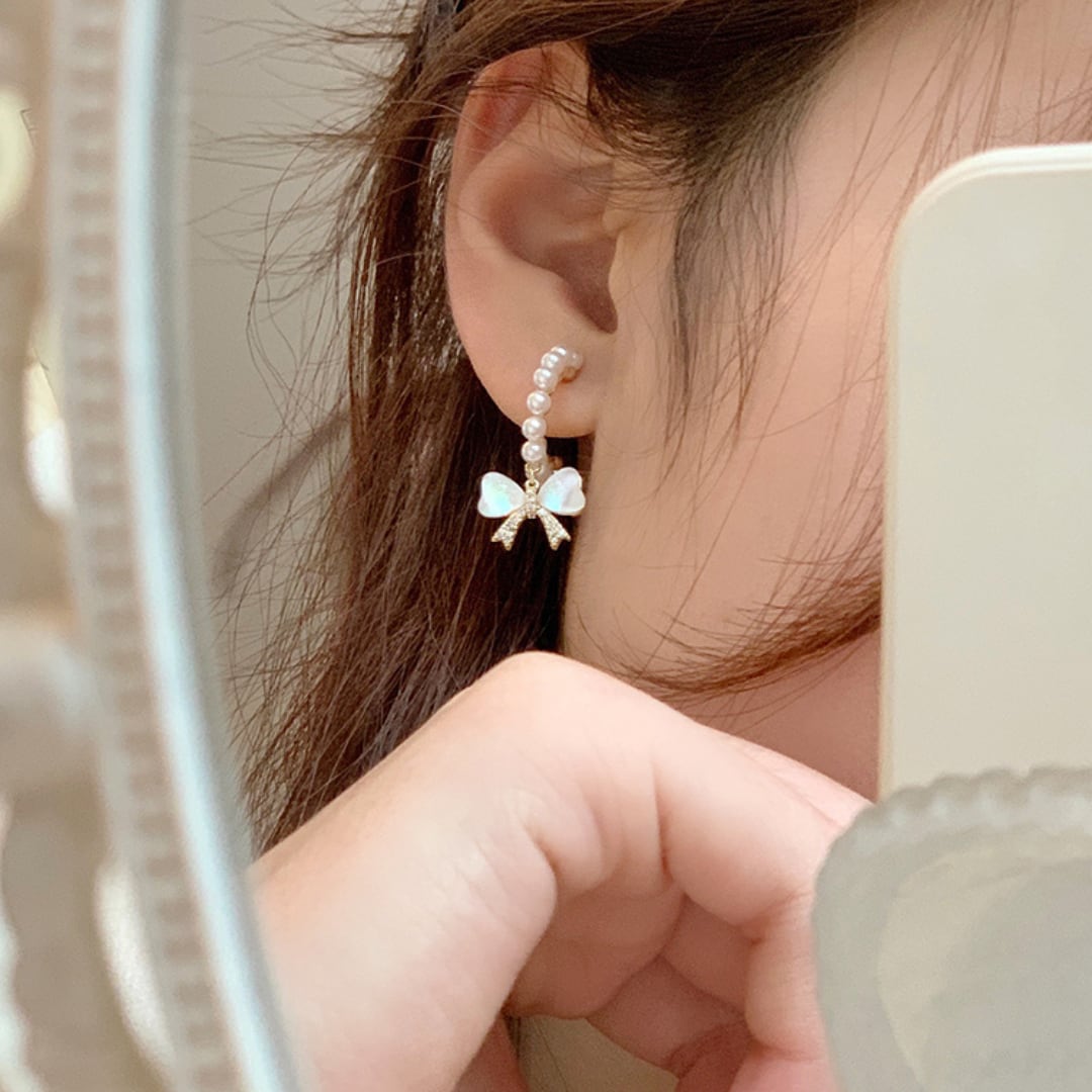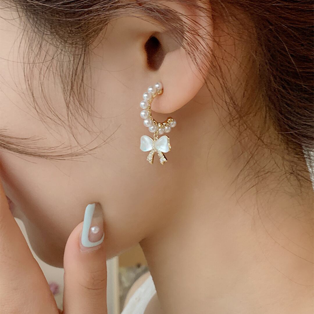 耳元にちょこんと沿うパールのイヤーカフ風デザインが、さりげなく上品な印象を演出。