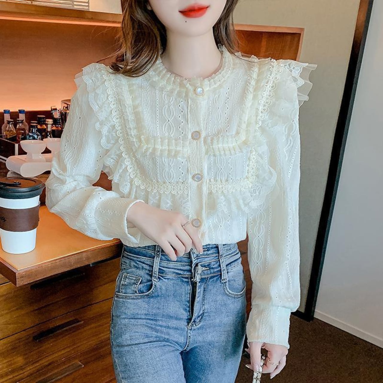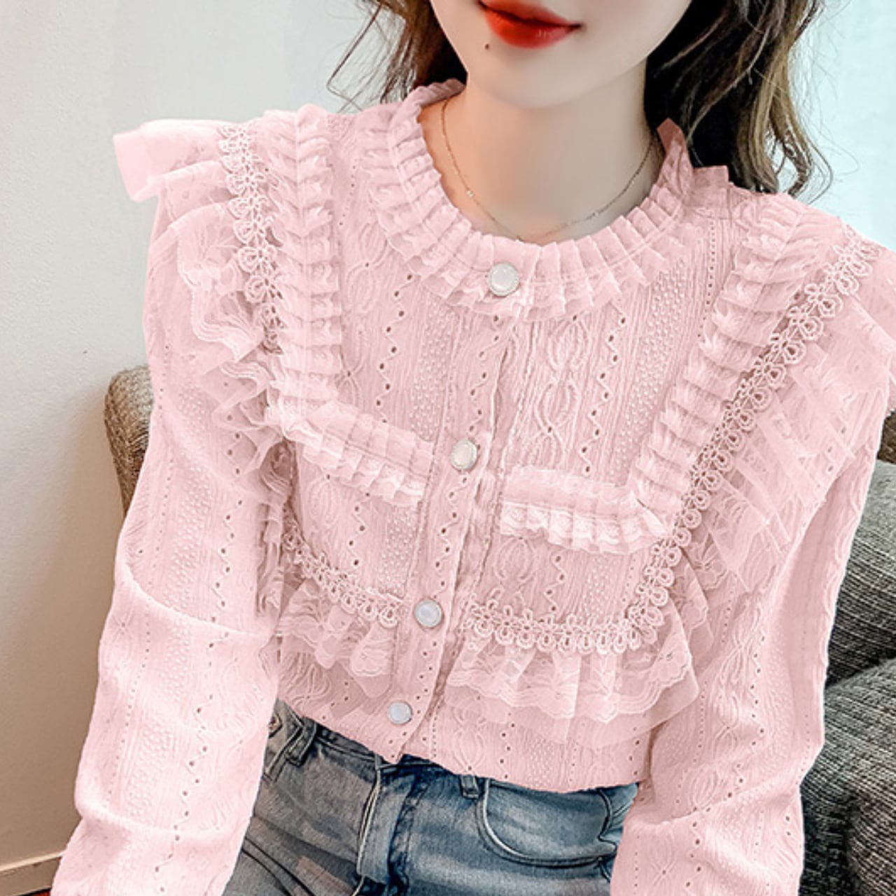 エレガントなレース使いと可愛らしいフリルデザインが特徴のロングスリーブブラウスです。普段使いから特別な場面まで、多彩なシーンで活躍するアイテムとなります。