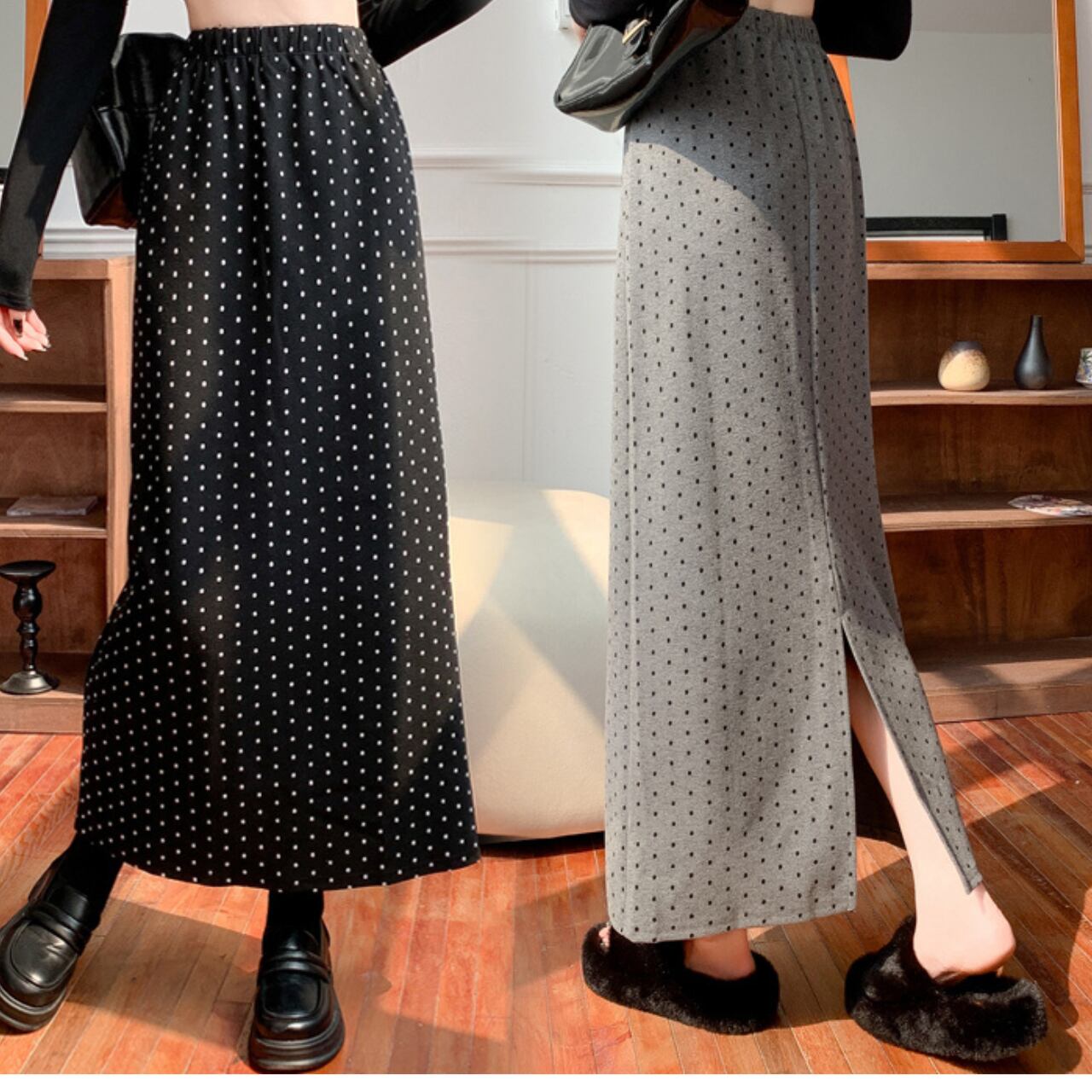水玉デザインと、ウエストゴムのはきやすいロングスカート。