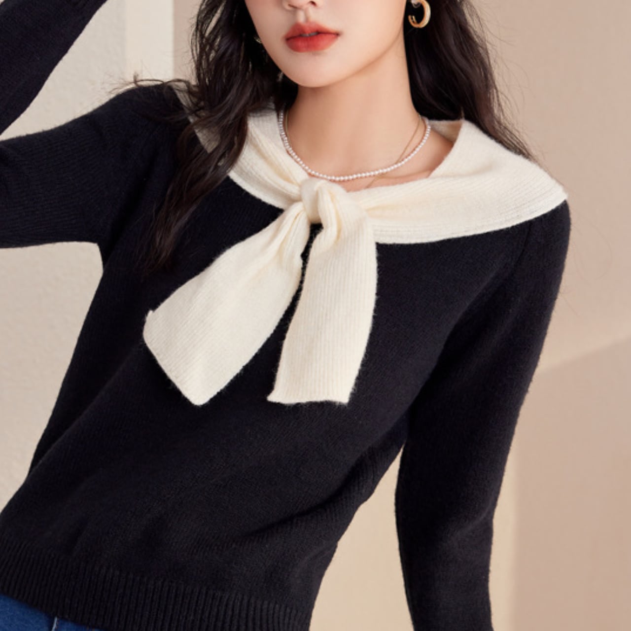 ビッグリボンがアクセントのカシミアセーター。柔らかく上質なカシミア素材を使用しており、肌触りが抜群です。シンプルながらも華やかなデザインで、カジュアルからオフィスまで幅広く活躍する一着。寒い季節もこのセーターがあれば心も体も温まります。