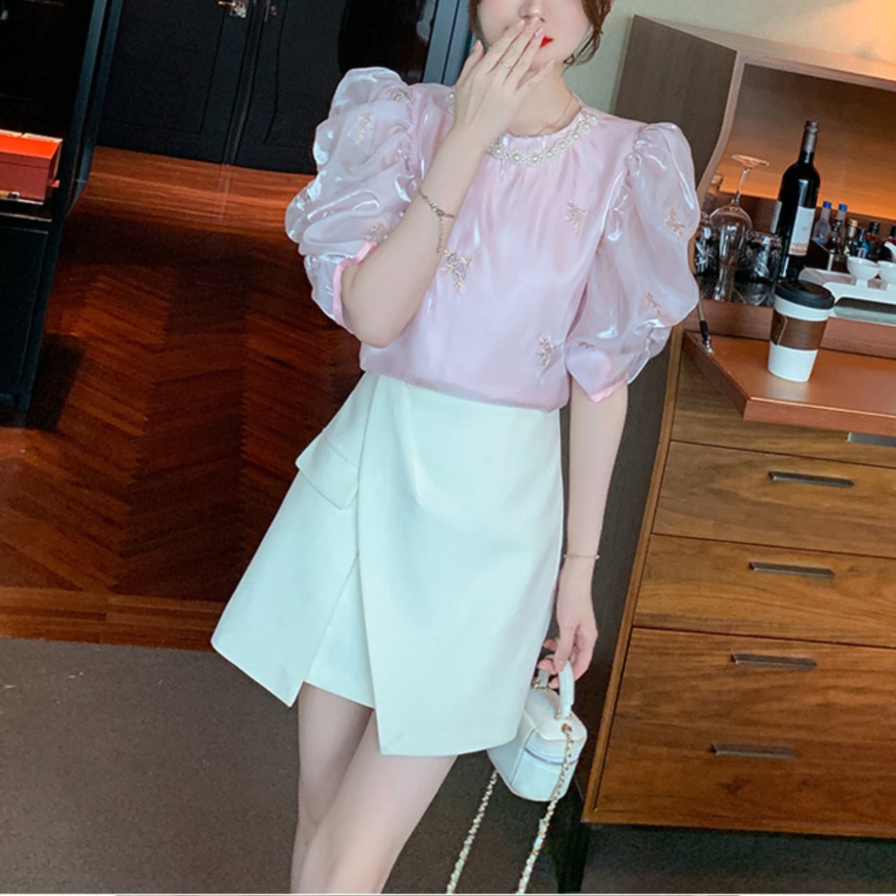 エレガントなパフスリーブとパールのアクセントが魅力のブラウス。女性らしいラインを強調しながら、華やかさを演出してくれます。軽やかな素材は、使い勝手もよく、デニムやスカートと合わせることでシーンを選ばずに活躍するアイテムです。カジュアルからフォーマルまで幅広いスタイルにマッチし、あなたのコーディネートを一層引き立てます。