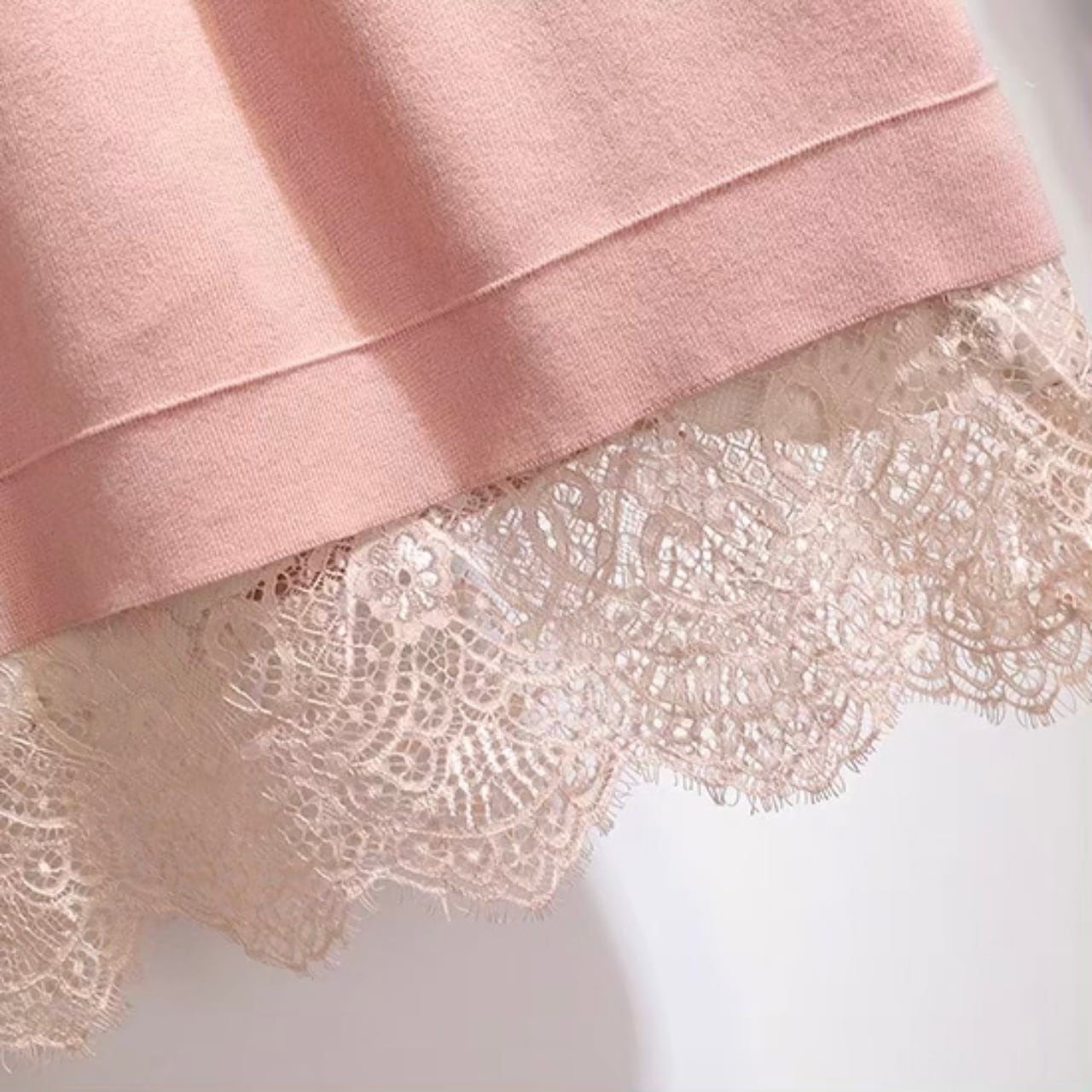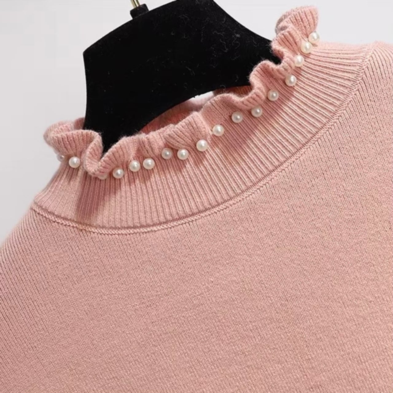 優雅なフリルにあしらわれたパールが華やかさを演出するニットワンピースです。
