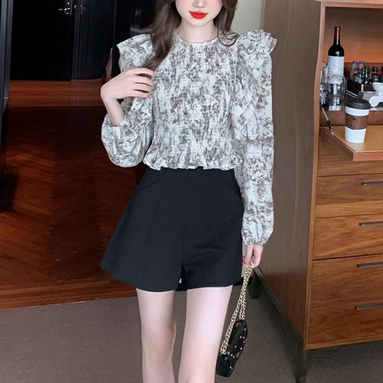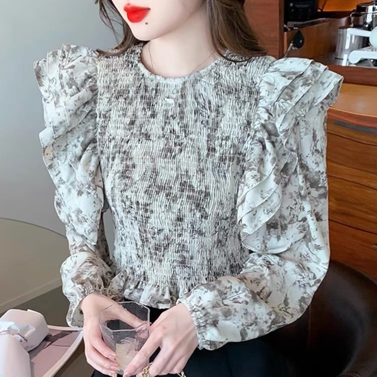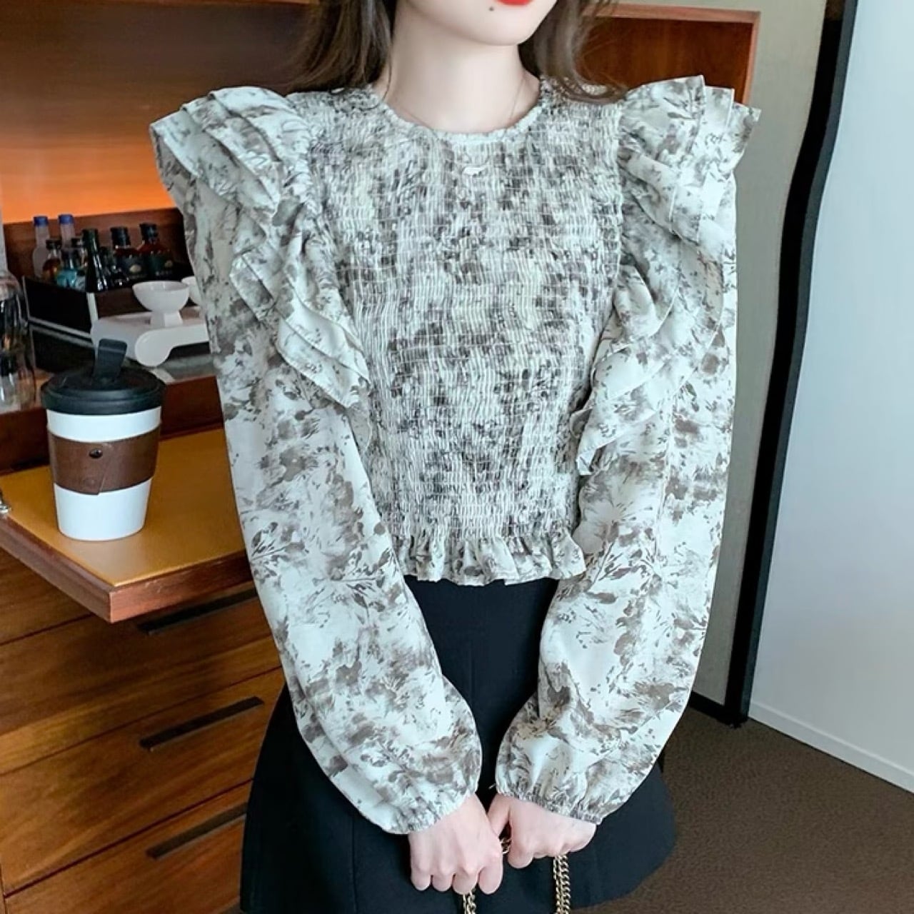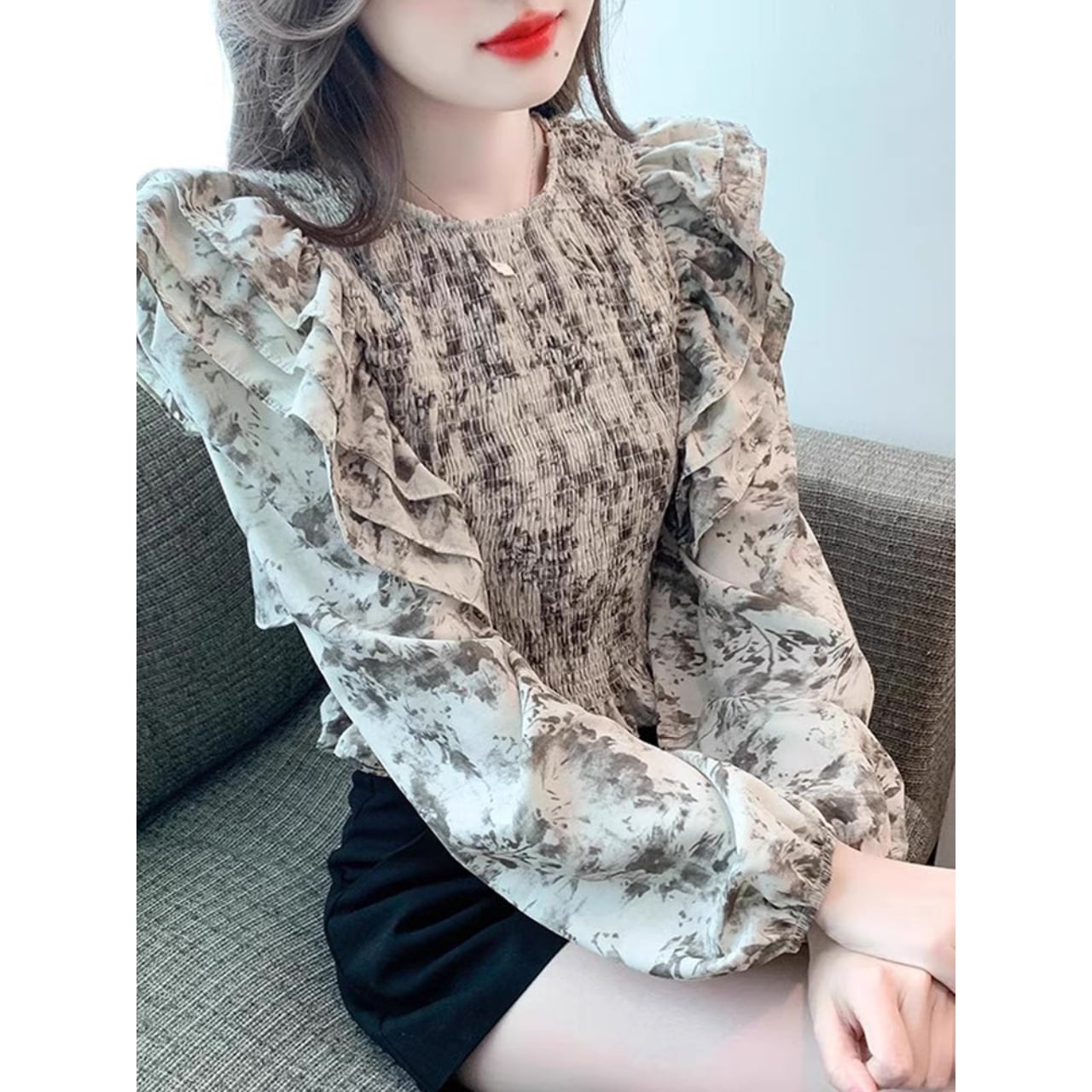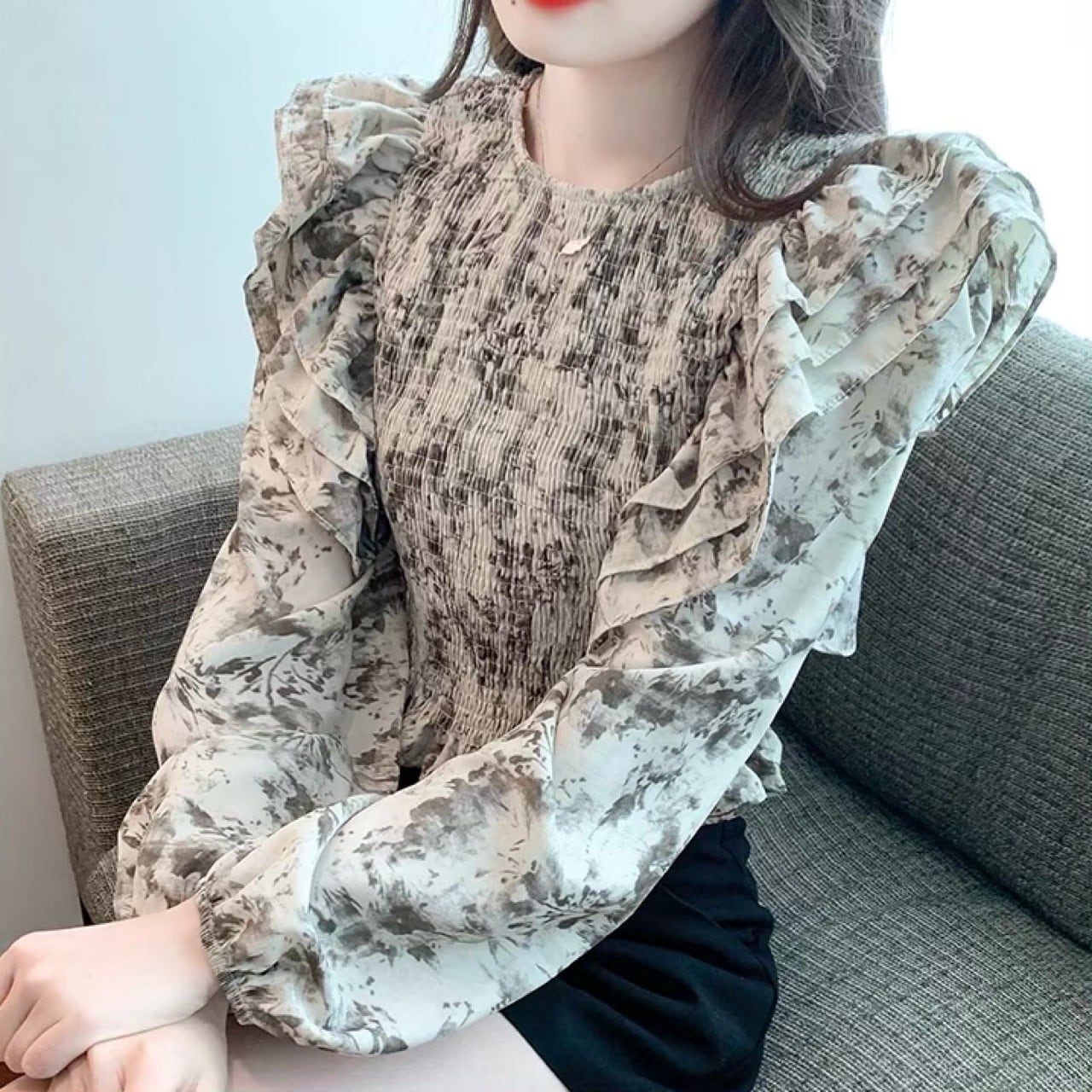 軽やかなシフォン素材を使用しており、華やかな花柄デザインとふんわりとしたフリルが、女性らしさを引き立てる一枚。