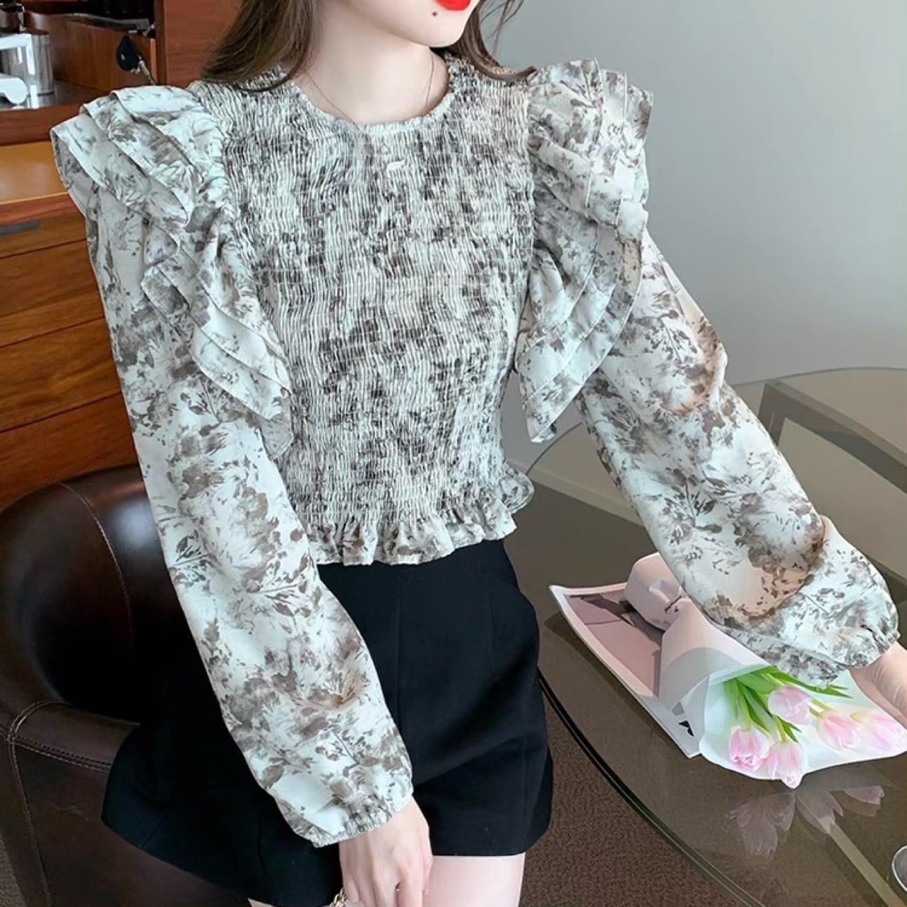 優雅なデザインが魅力の花柄フリルシフォンブラウス。