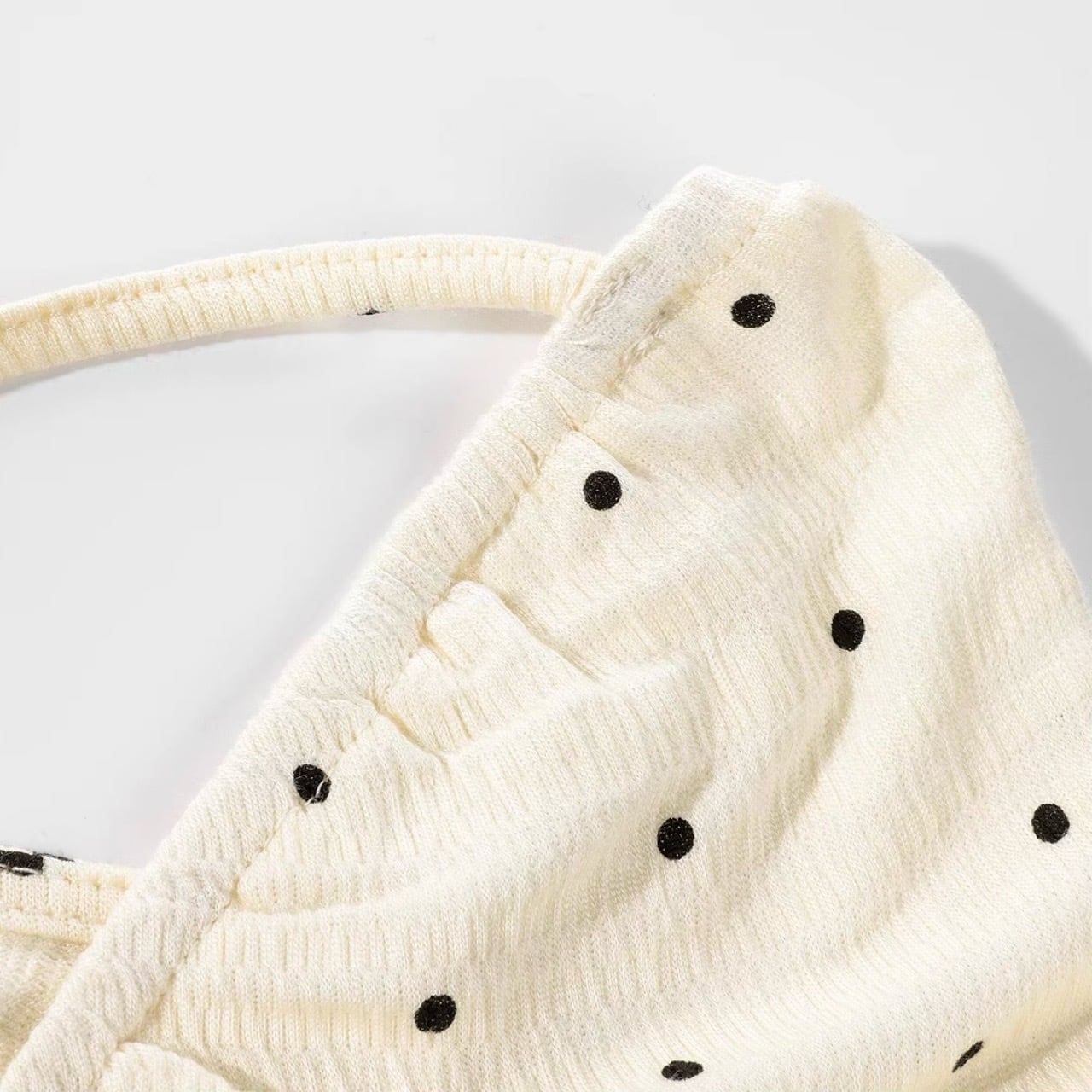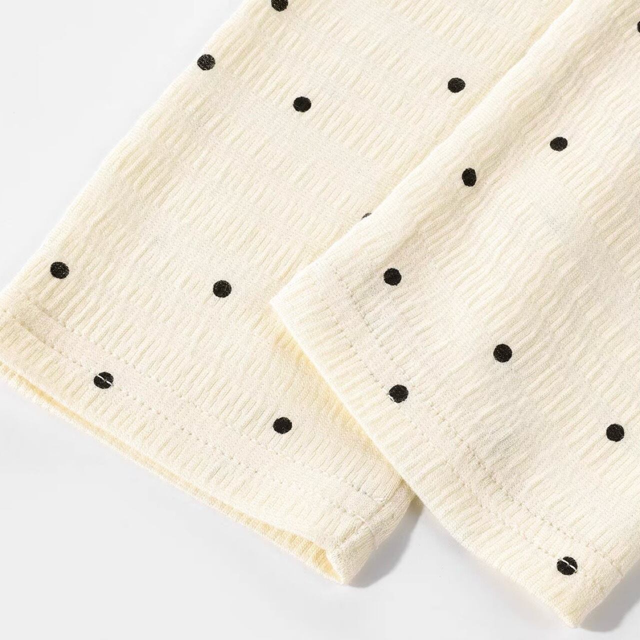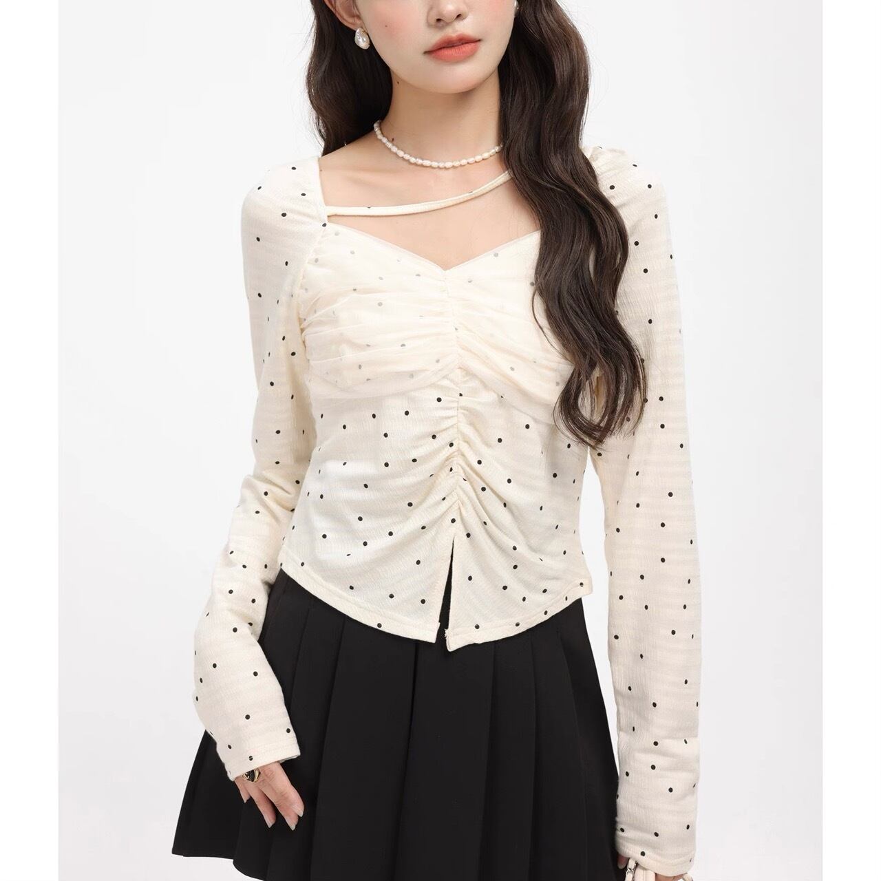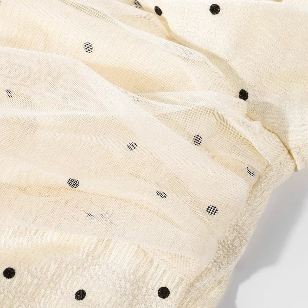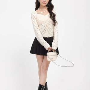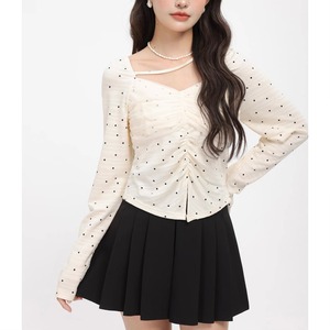 愛らしいドット柄とシャーリングデザインが特徴のブラウスです。