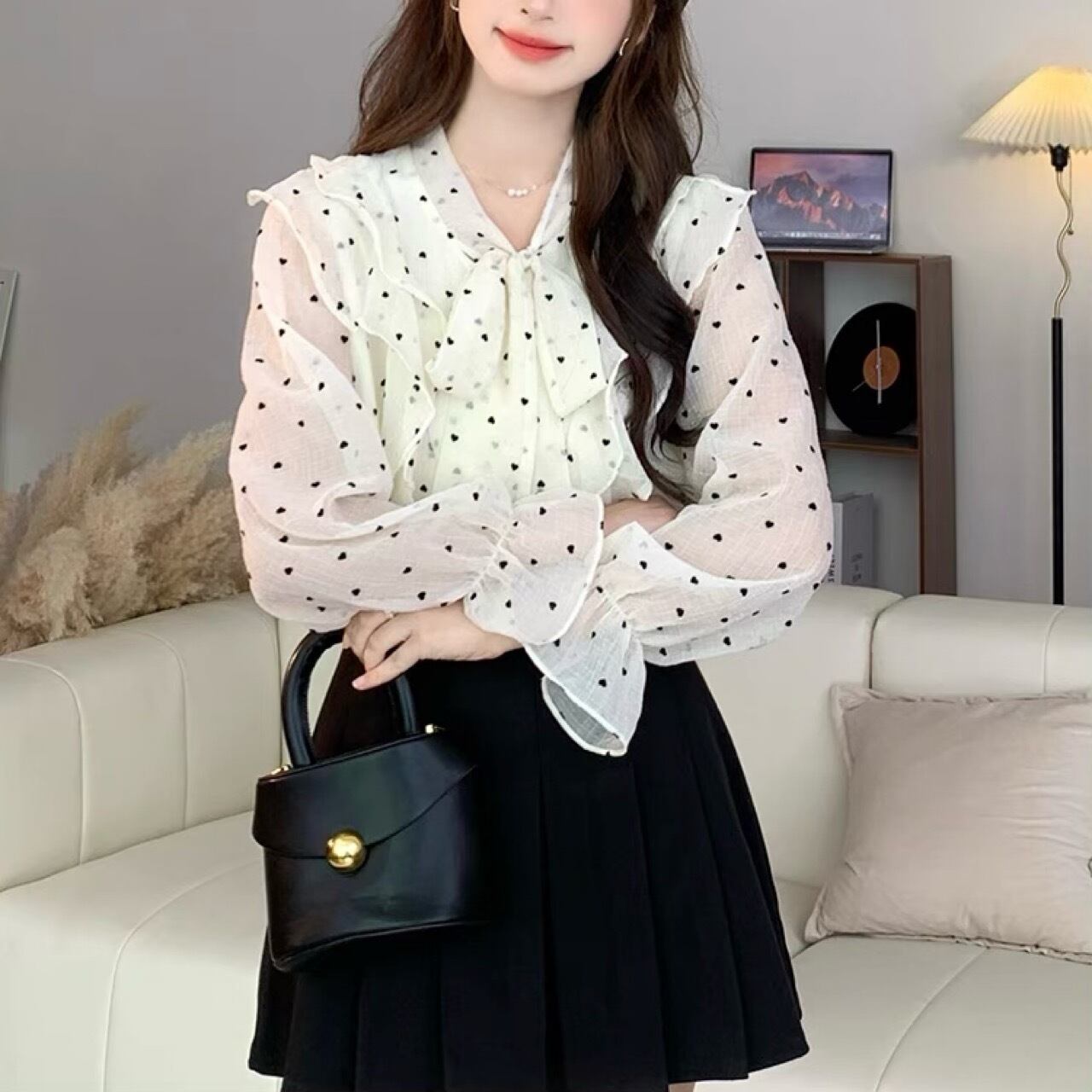 かわいらしいドット柄と華やかなフリル、レースが特徴のブラウスです。