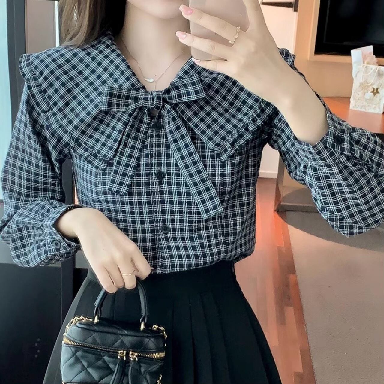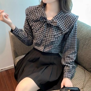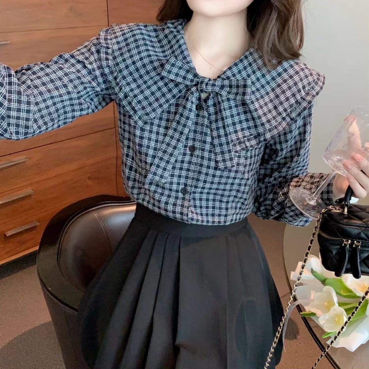 個性的なビッグカラーとリボンタイが特徴のチェック柄ブラウスです。
