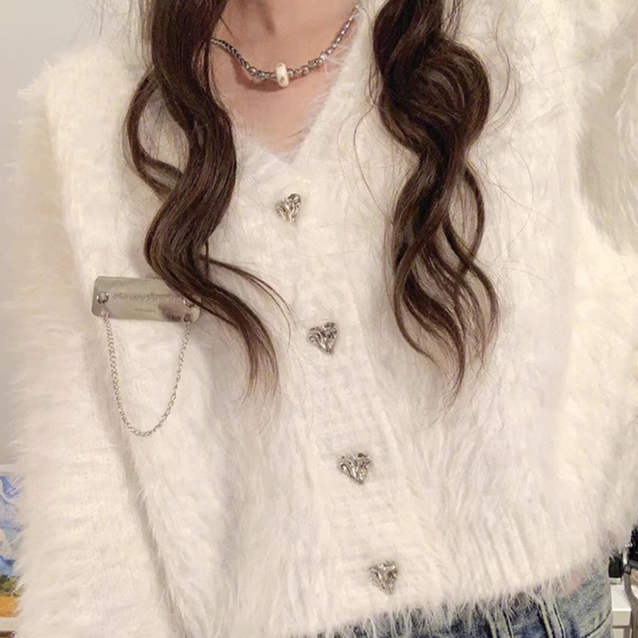 愛らしいハートボタンがアクセントとなる、ファー素材を使用したカーディガンです。