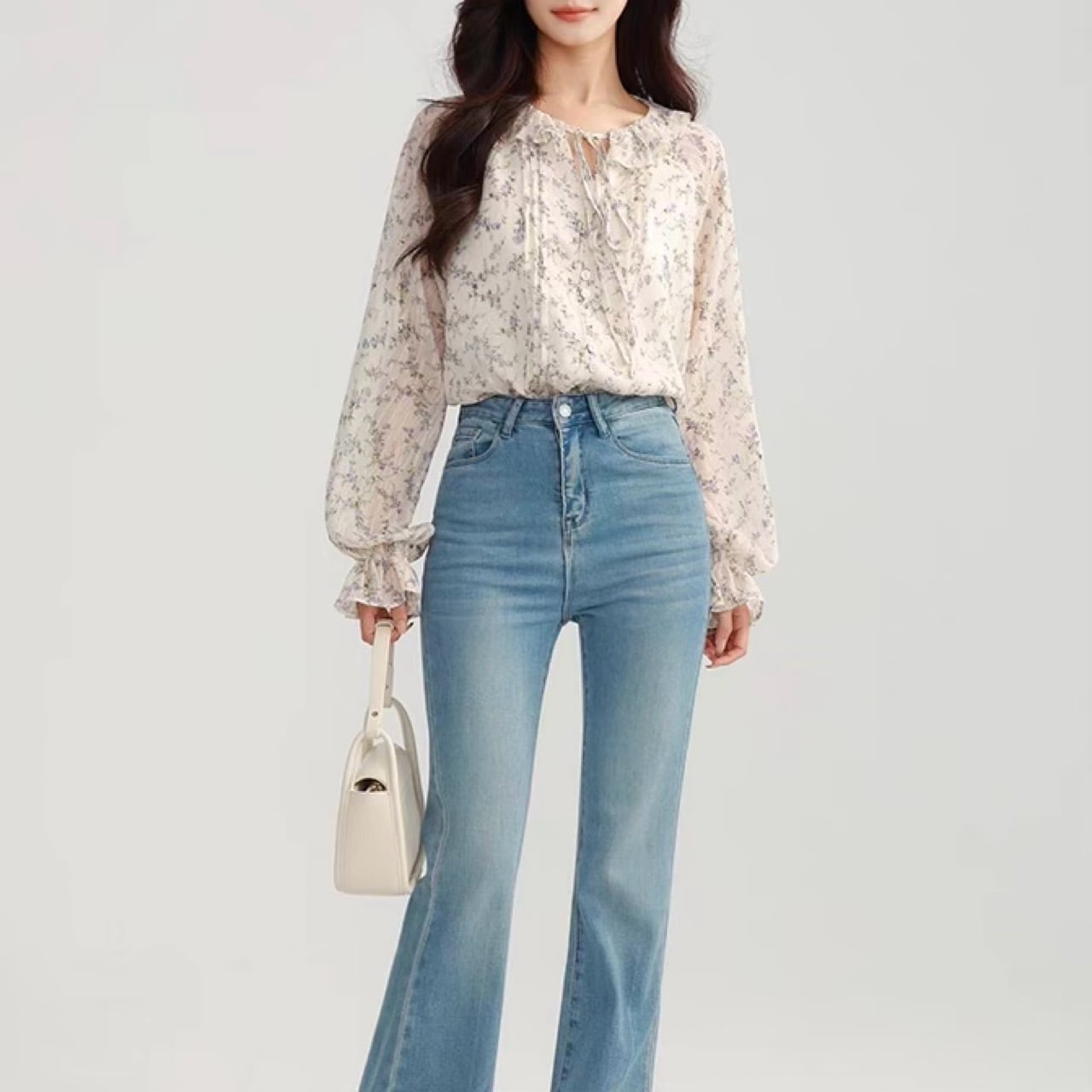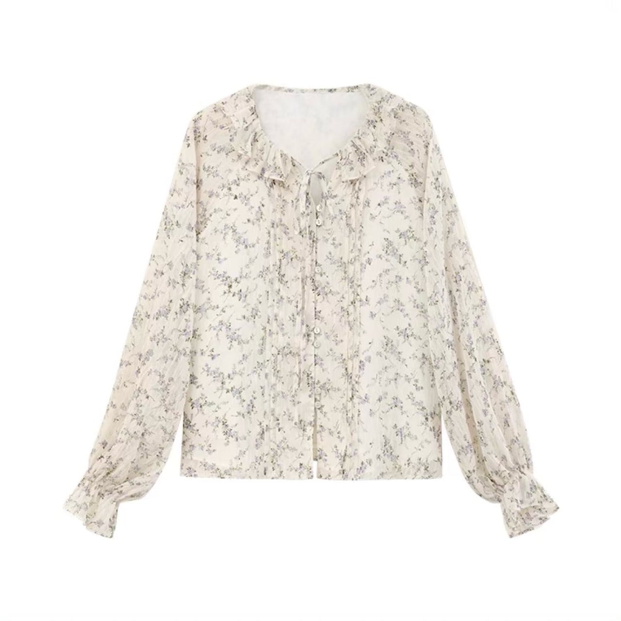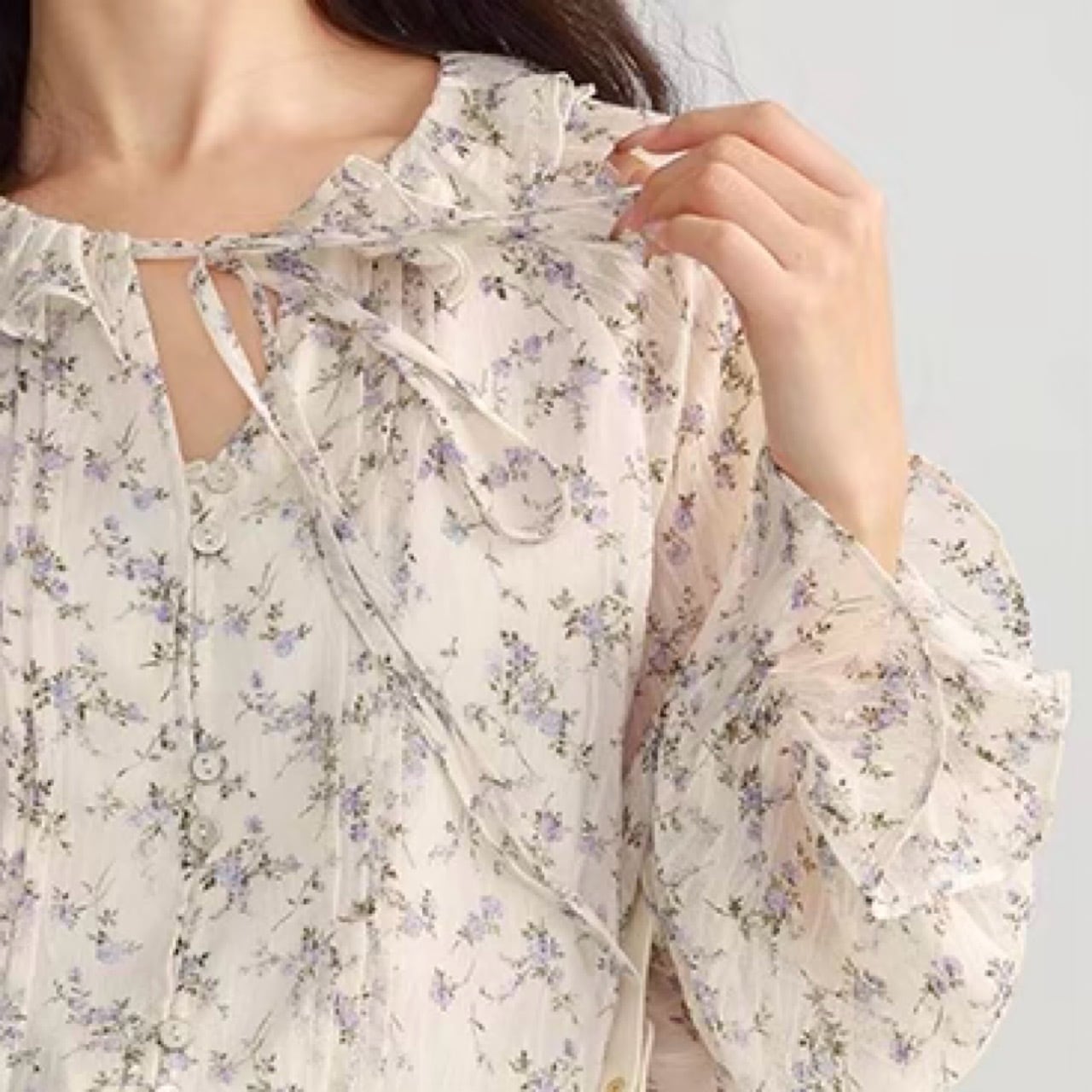 華やかなフローラルデザインとフリルが魅力のフローラル フリル シフォン ブラウス。